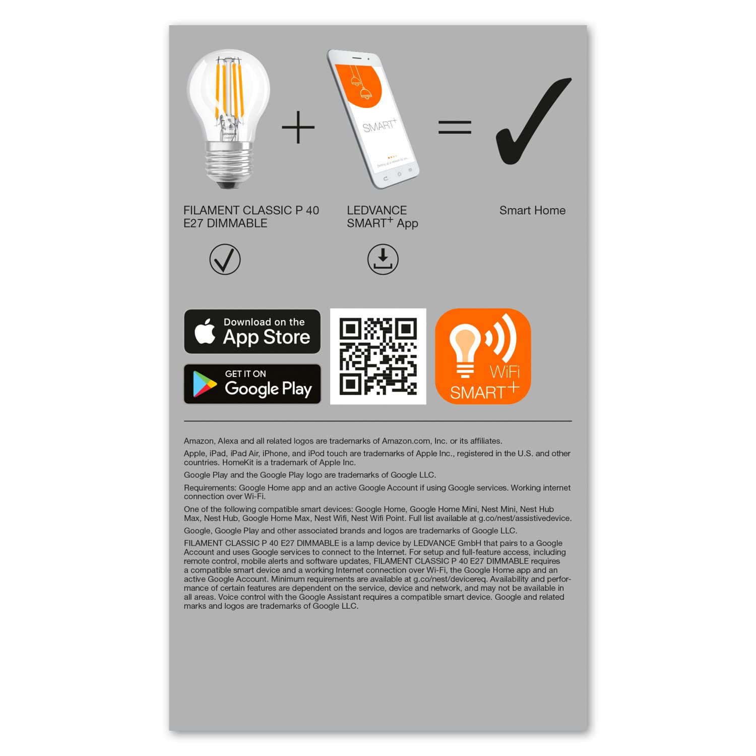 Klassische Miniballform mit Glühwendel-Design mit WiFi-Technologie. Produkteigenschaften: Steuerbar über LEDVANCE SMART+ WiFi App (mit mindestens Android 4.4 oder iOS 9.0). Steuerung über Google Assistant oder Amazon Alexa möglich. Netzwerkprotokoll: WiFi. Dimmbar. Lebensdauer: bis zu 15.000 h. Lichtfarbe: Warmweiss (2.700 K). Produktvorteile: Drahtlose Steuerung über App. Einfache Installation und Nutzung. Enthält kein Quecksilber. Anwendungsgebiete: Allgemeinbeleuchtung. Wohnräume. Gewerbe (Hotels, Bars, Boutiquen usw.). Aussenanwendungen nur in geeigneten Leuchten.