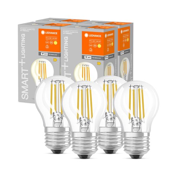 LEDVANCE Smarte LED-Lampe mit Wifi Technologie, Sockel E27, Dimmbar, Warmweiss (2700K), Tropfenform, Klares Filament, Ersatz für herkömmliche 40W-Glühbirnen, steuerbar mit Alexa, Google & App, 4er-Pack