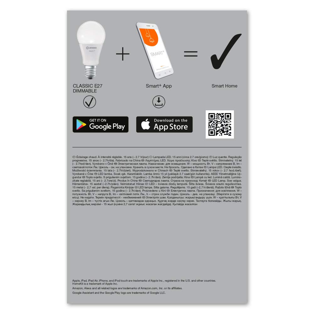 Klassische Kolbenform mit WiFi-Technologie. Produkteigenschaften: Steuerung über LEDVANCE SMART+ WiFi App (ab Android 6.0) oder iPhone (ab iOS 10). Steuerung über Google Assistant oder Amazon Alexa möglich. Netzwerkprotokoll: WiFi. Dimmbar. Produktvorteile: Drahtlose Steuerung über App. Einfache Installation und Nutzung. Enthält kein Quecksilber. Anwendungsgebiete: Allgemeinbeleuchtung. Wohnräume. Gewerbe (Hotels, Bars, Boutiquen usw.). Aussenanwendungen nur in geeigneten Leuchten.