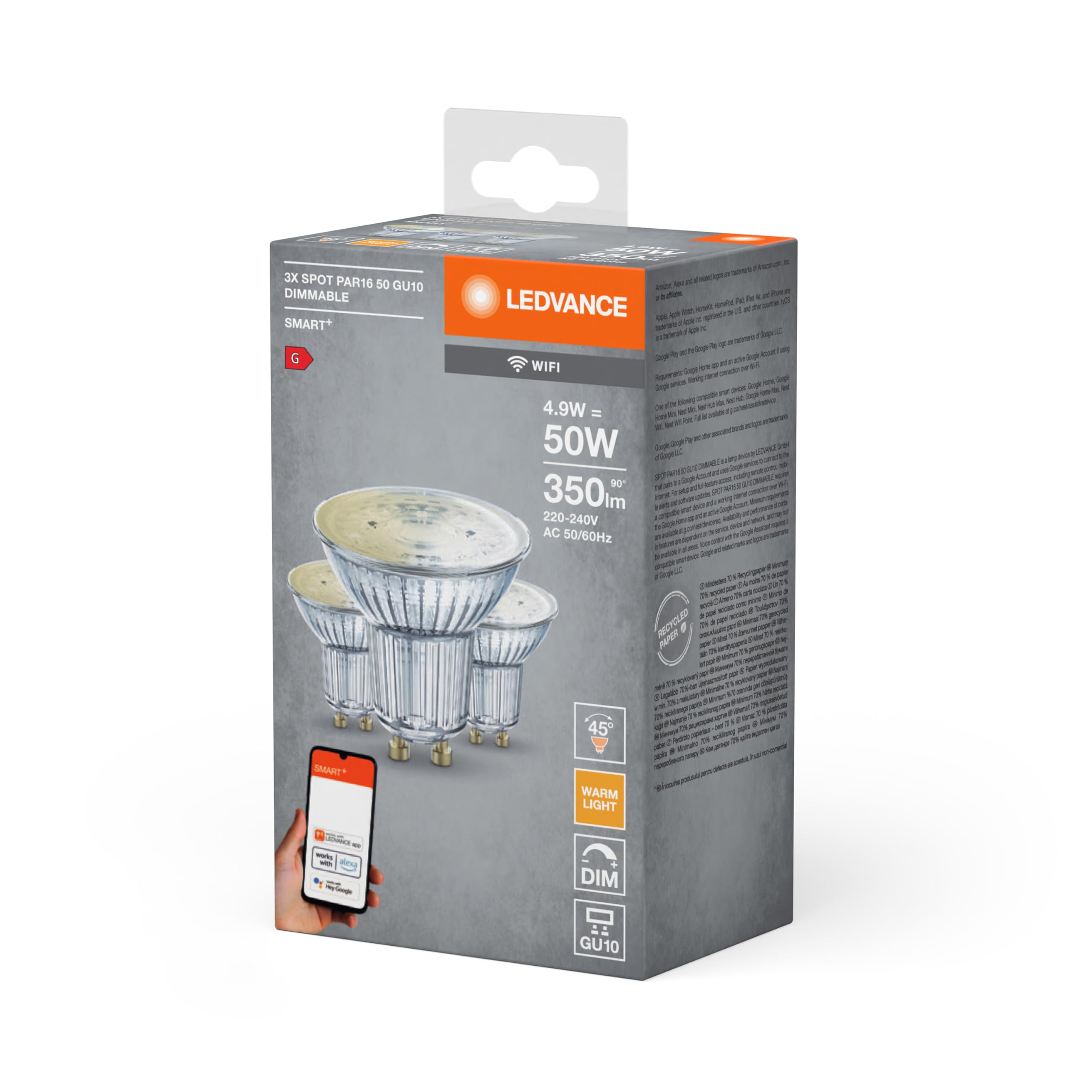 Reflektorform mit WiFi-Technologie. Produkteigenschaften: Steuerung über LEDVANCE SMART+ WiFi App (ab Android 6.0) oder iPhone (ab iOS 10). Steuerung über Google Assistant oder Amazon Alexa möglich. Netzwerkprotokoll: WiFi. Dimmbar. Produktvorteile: Drahtlose Steuerung über App. Einfache Installation und Nutzung. Enthält kein Quecksilber. Anwendungsgebiete: Allgemeinbeleuchtung. Wohnräume. Gewerbe (Hotels, Bars, Boutiquen usw.). Aussenanwendungen nur in geeigneten Leuchten.