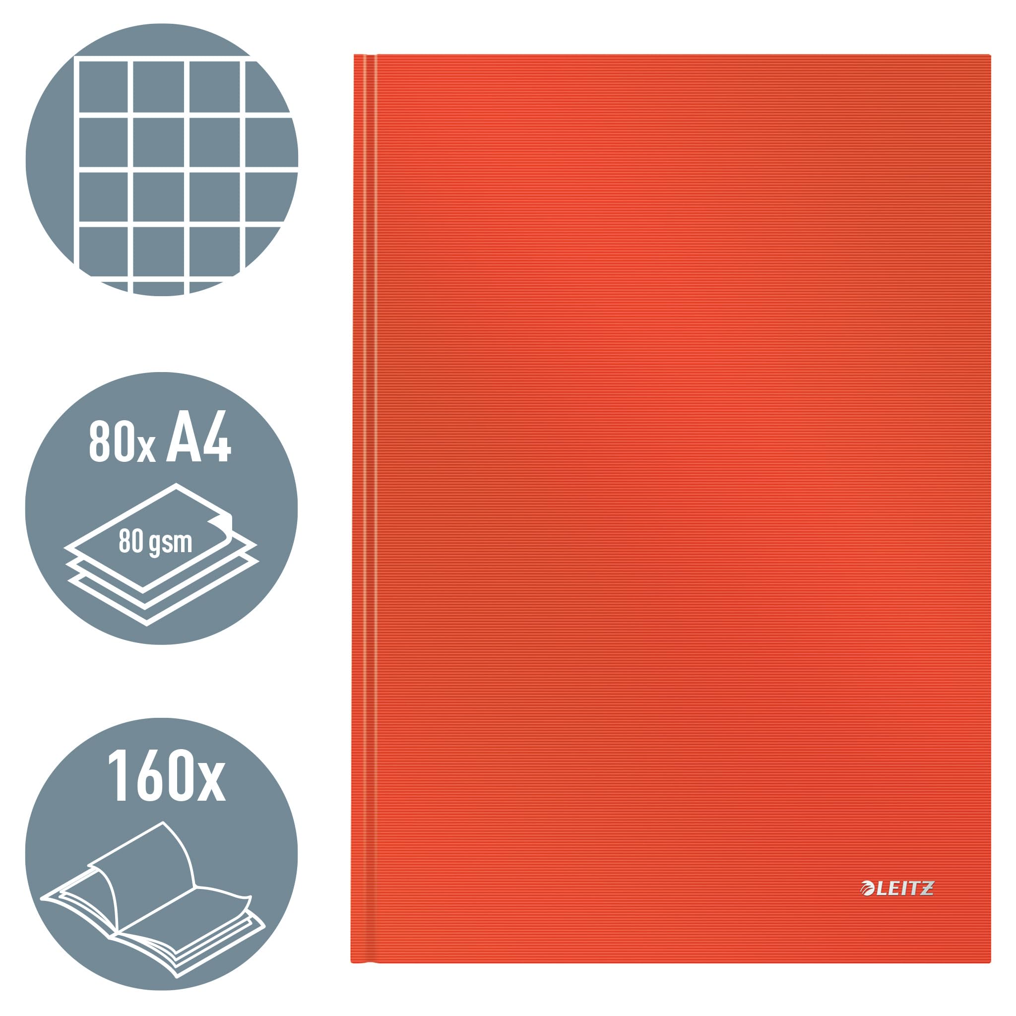 Leitz A4 Notizbuch kariert, 160 Seiten, 80 Blatt FSC zertifiziertes 80 g/m² Papier, Stabiler, kratzfester Hardcover-Einband, Für Büro, Schule oder als Tagebuch, Solid Serie, Hellrot, 46640020