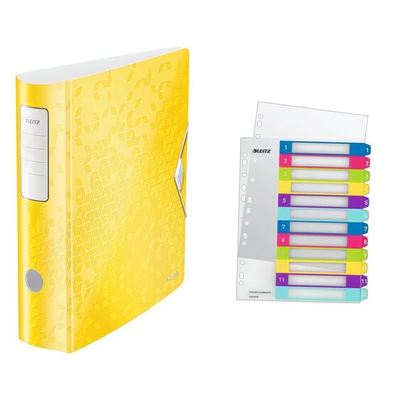 Leitz Set Qualitäts-Ordner 180° Active WOW A4, Breit, 8,2 cm, Gummibandverschluss, Gelb + Leitz Register für A4, PC-beschriftbares Deckblatt, und 12 Trennblätter, WOW Serie, 11060016 + 12440000