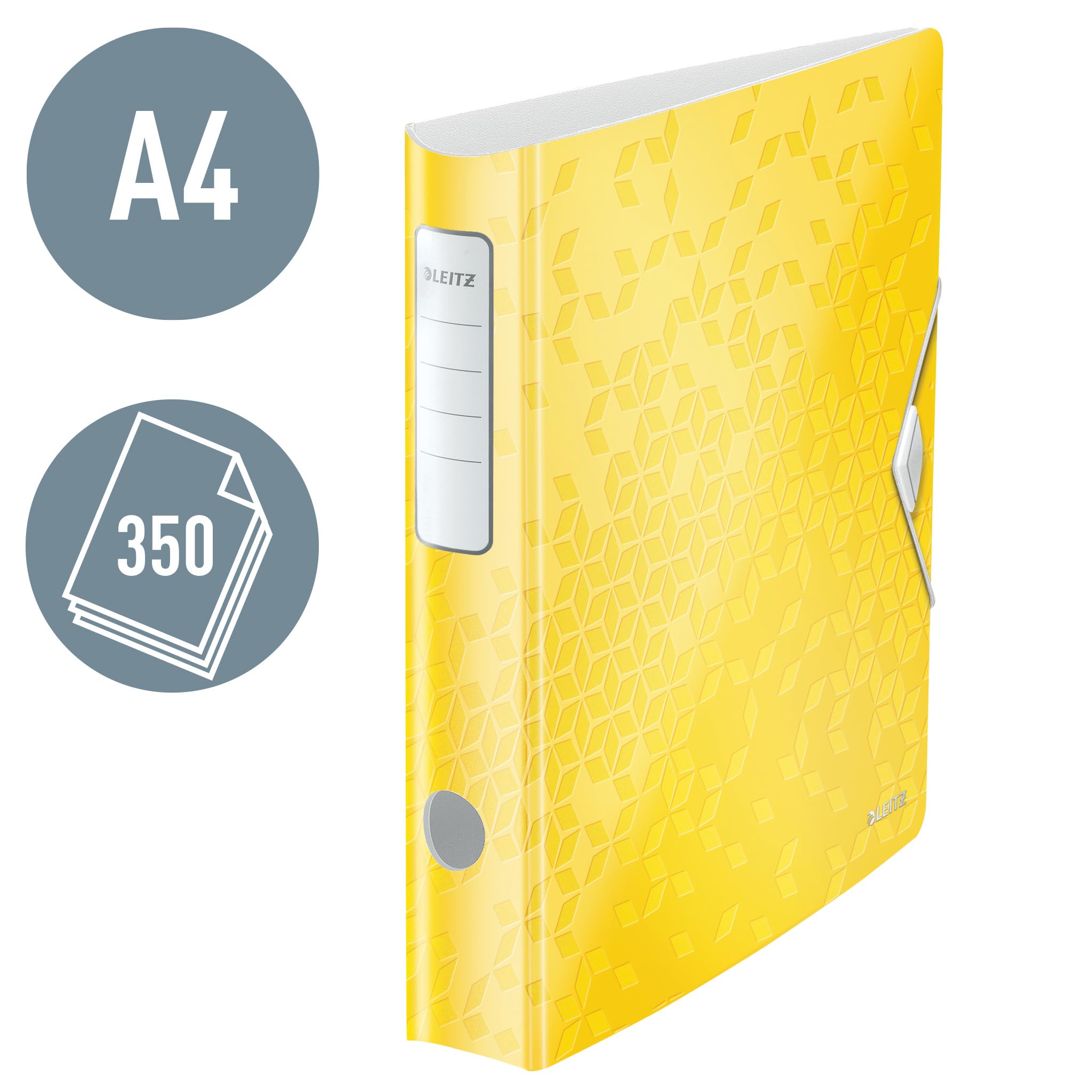 Gelber Qualitäts-Ordner 180° in A4 Format für bis zu 350 Blatt (80 g/m2 Papier), 65 mm Rückenbreite, Ideal für zu Hause, in der Schule und im Büro, Einfache Beschriftung mit EasyPrint Etikettenvorlagen von der Leitz Webseite, Lieferung inkl. selbstklebender Rückenetiketten (BxH) 3,5 x 14,5 cm, Abgerundetem Rücken mit Griffloch für bequemes Tragen, 50% weiteres Öffnen und 20% schnelleres Abheften dank patentierter 180°-Präzisionsmechanik, Raffinierter Verschluss mit elastischem Gummiband zur sicheren Aufbewahrung des Inhalts, Einzigartiger WOW Effekt für zu Hause und im Büro mit diesem und weiteren Produkten des Leitz Sortiments, Leichtes Polyfoam (2,8 mm), 3 Fächer zur Aufbewahrung von Dokumenten, Visitenkarten und Stiften, Lieferumfang: 1 x Leitz Qualitäts-Ordner 180° Active WOW, 2 D-Ring Mechanik, Masse (BxHxT): 6,5 x 31,8 x 30,8 cm, Farbe: Gelb, WOW, 11070016