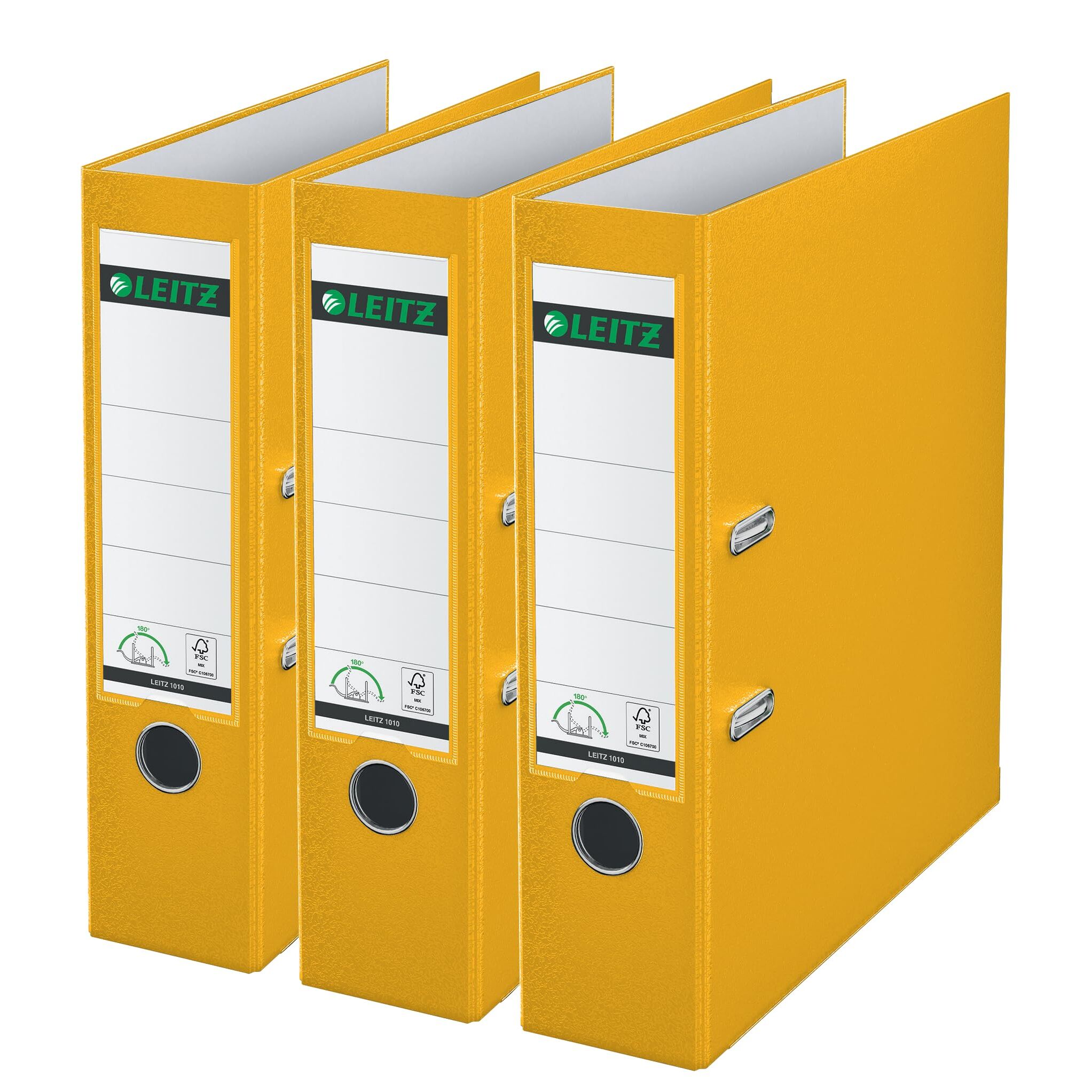 Leitz Qualitäts-Ordner 180° Plastik, 3er Pack, das Original, A4 Aktenordner 8 cm breit, 90% Recycling-Karton, 30% Pre-Consumer Recycling-Kunststoff, 180° Mechanik, 600 Blatt Kapazität, Gelb, 310335015