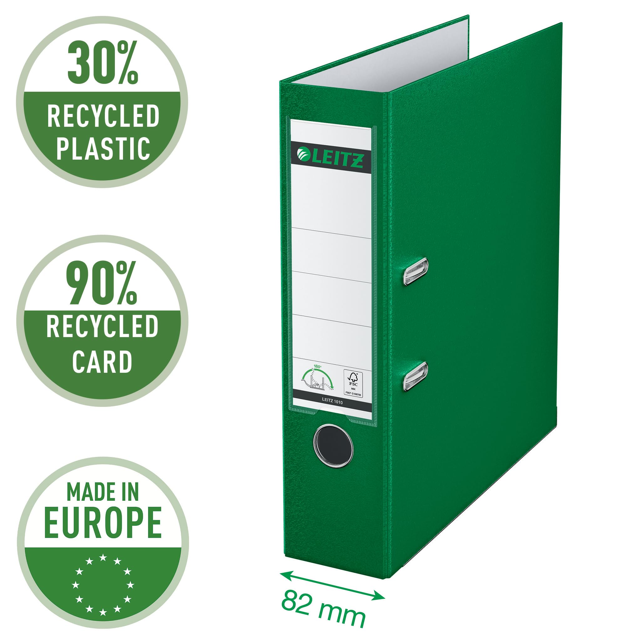 Leitz Qualitäts-Ordner 180° Plastik, das Original, DIN A4 Aktenordner 8 cm breit, 90% Recycling-Karton, 30% Pre-Consumer Recycling-Kunststoff, Mit 180° Mechanik, 600 Blatt Kapazität, Grün, 10105055