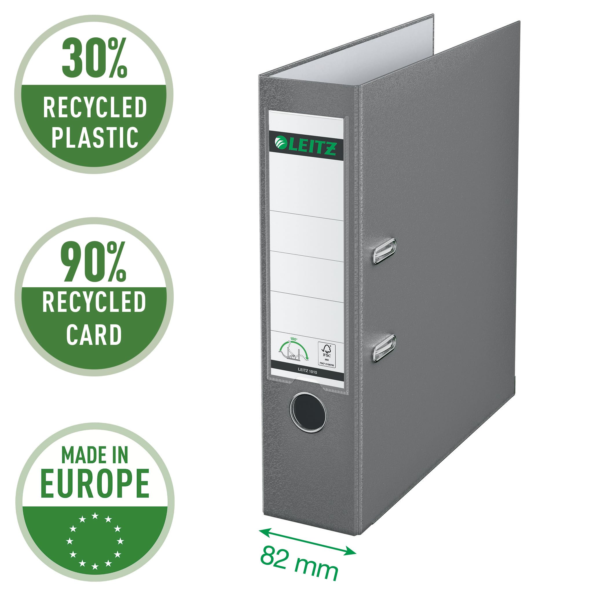 Leitz Qualitäts-Ordner 180° Plastik, das Original, DIN A4 Aktenordner 8 cm breit, 90% Recycling-Karton, 30% Pre-Consumer Recycling-Kunststoff, Mit 180° Mechanik, 600 Blatt Kapazität, Grau, 10105085