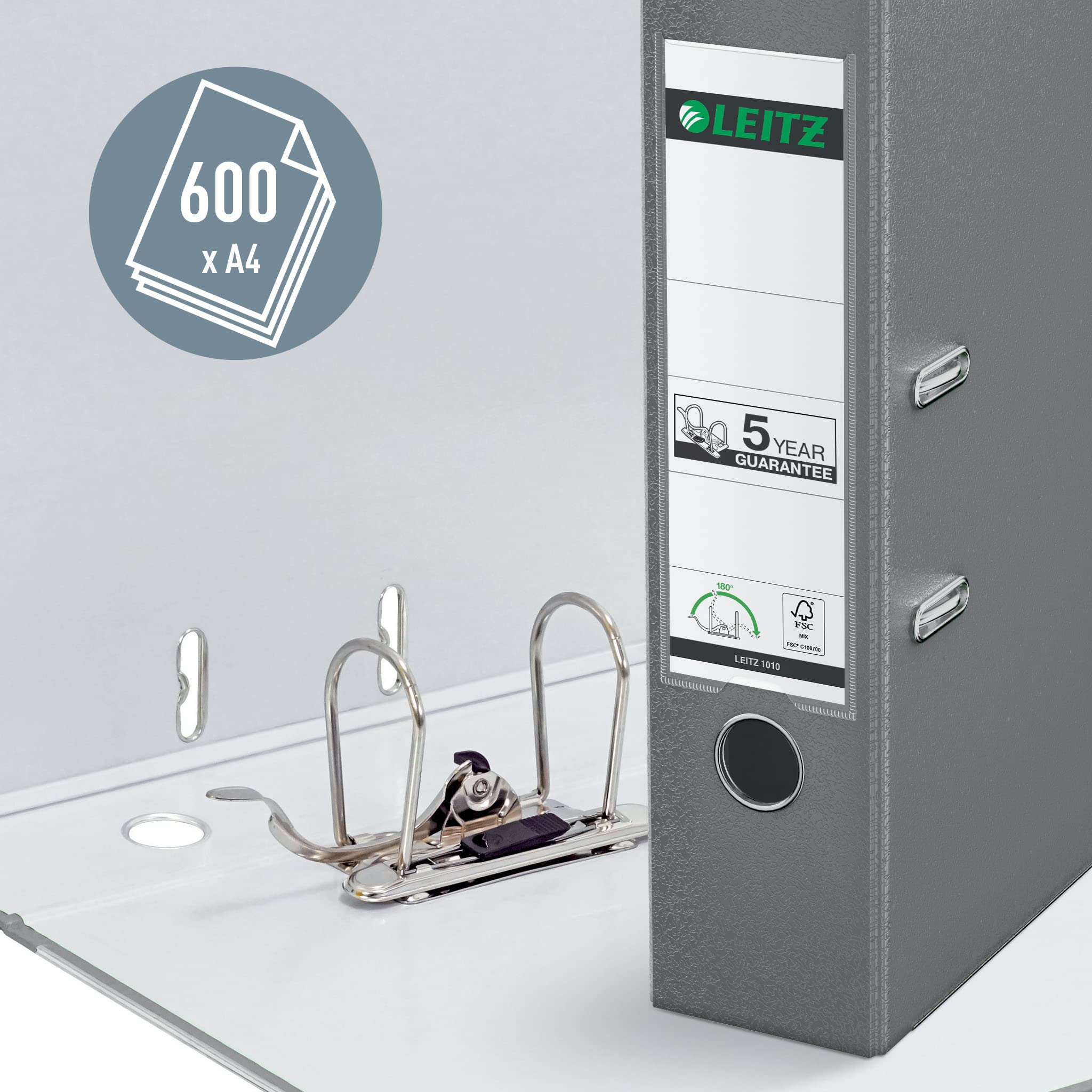 Leitz Qualitäts-Ordner 180° Plastik, 10er Pack, das Original, DIN A4 Aktenordner 8 cm breit, 90% Recycling-Karton, 30% Pre-Consumer Recycling-Kunststoff, Mit 180° Mechanik, 600 Blatt, Grau, 10101085