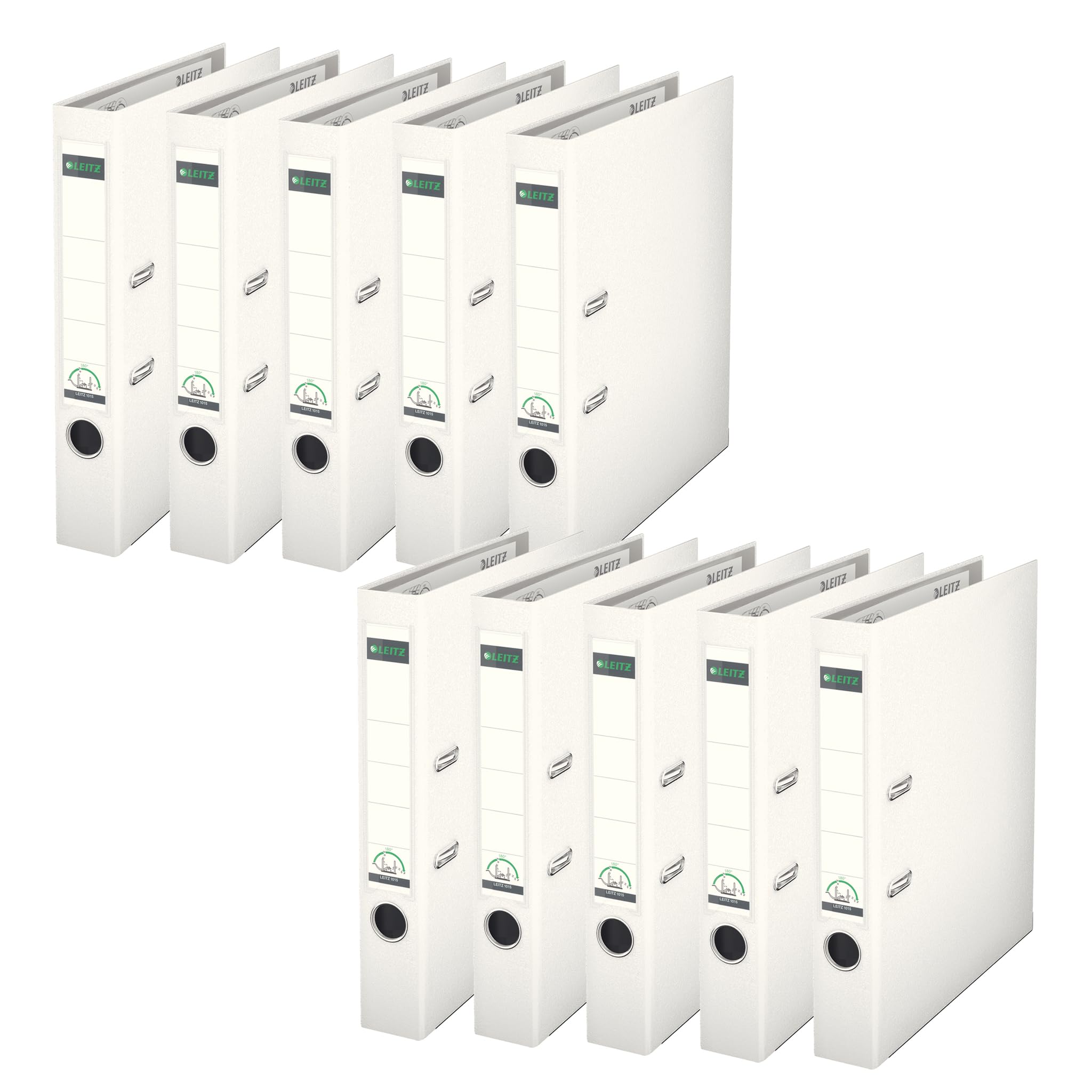 Leitz Qualitäts-Ordner 180° Plastik, 10er Pack, das Original, DIN A4 Aktenordner 5 cm schmal, 90% Recycling-Karton, 30% Pre-Consumer Recycling-Kunststoff, Mit 180° Mechanik, 350 Blatt, Weiss, 10151001