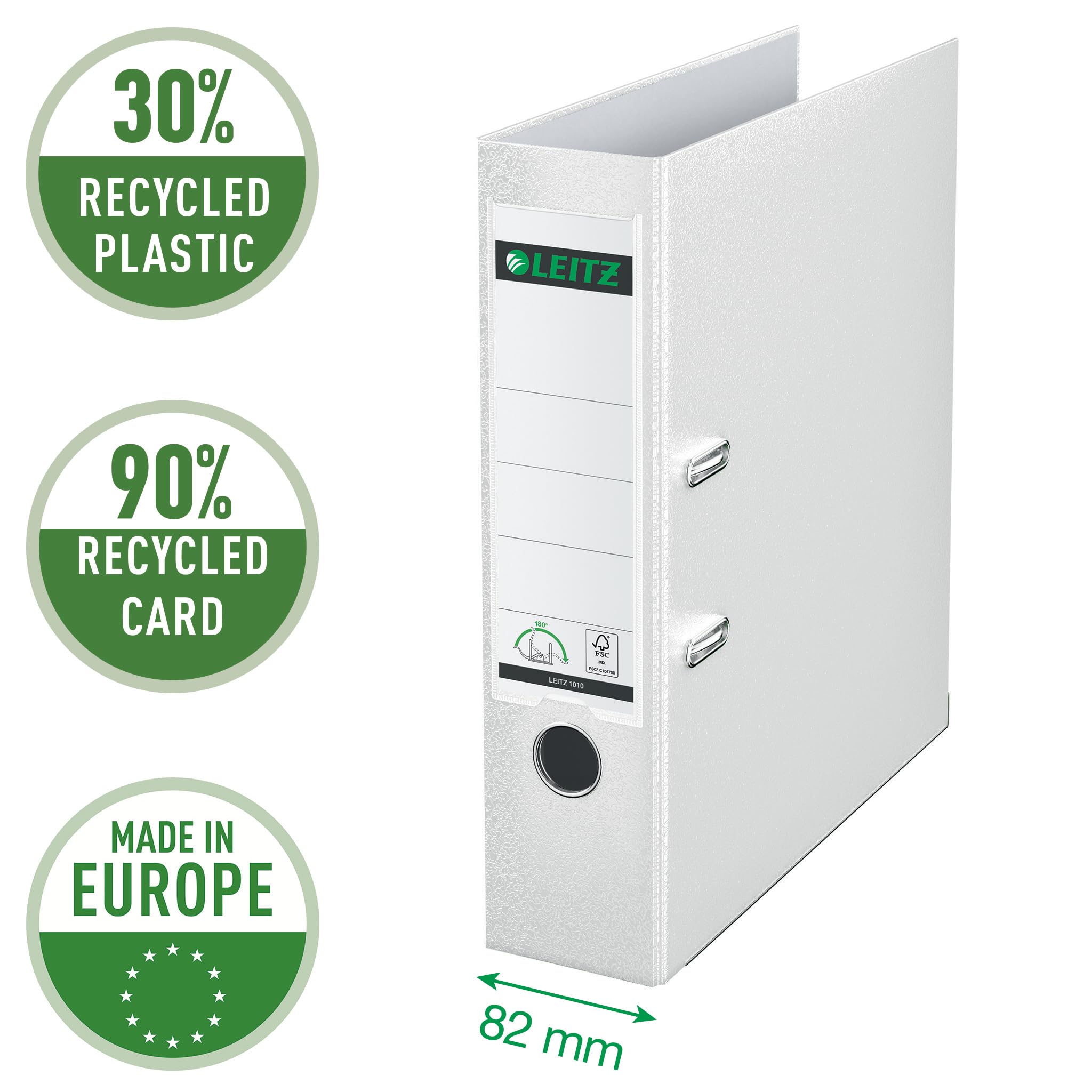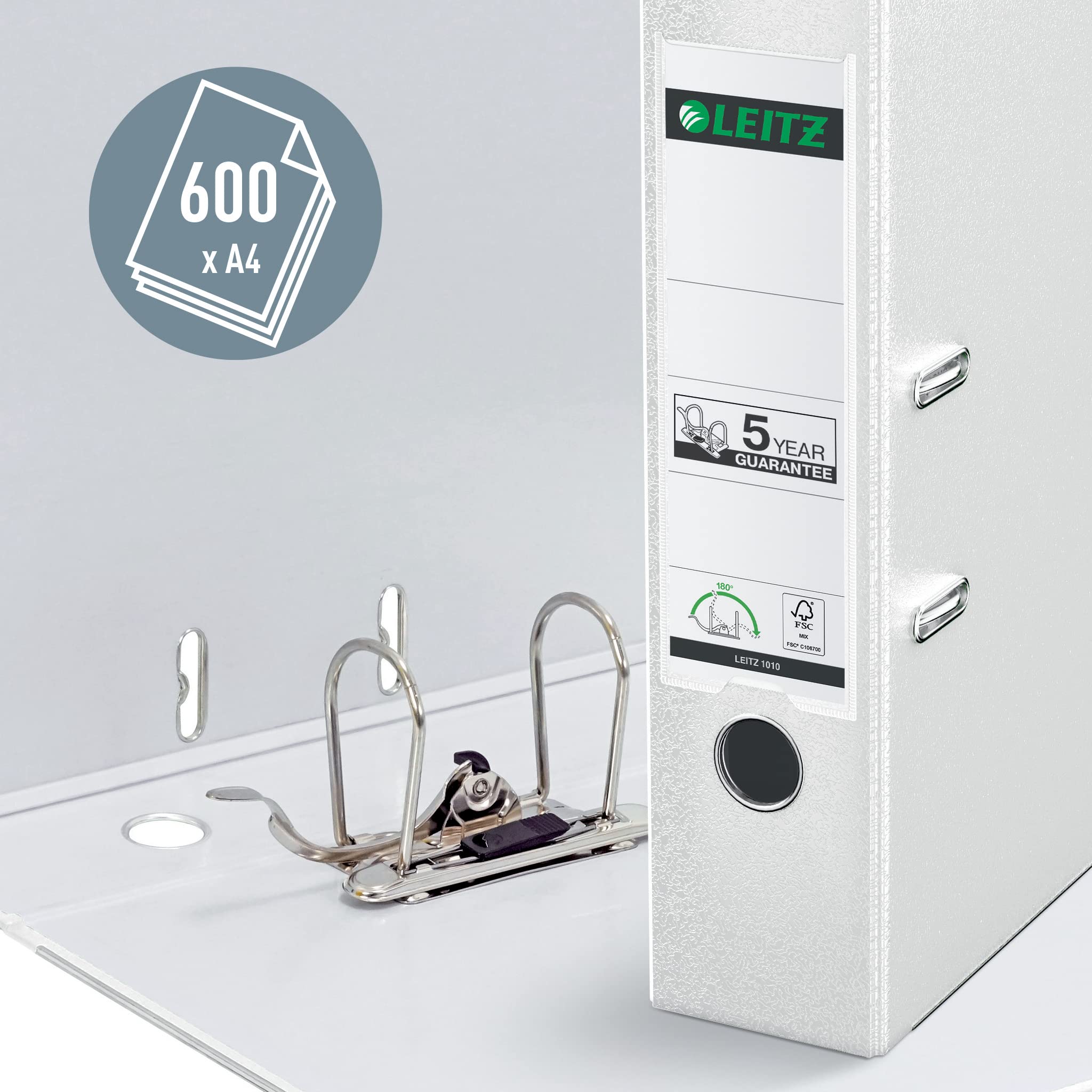 Qualitäts-Ordner in Weiss, Schmutz- und feuchtigkeitsabweisende PP-Folie aussen, 8 cm Rückenbreite, Zur Ablage von bis zu 600 (80 g/m²) Blatt, Zur häufigen Nutzung für Zuhause, in der Schule oder im Büro - Austauschbare Etiketten dank Etikettentasche am Rücken, Ersatz-Etiketten erhältlich, Individuelle Gestaltung dank Leitz-Easyprint auf der Leitz-Homepage - 50 Prozent weiteres Öffnen und 20 Prozent schnelleres, beidseitiges Abheften dank stabiler, patentierter 180°-Präzisionsmechanik, Hohe Schliesskraft, auf Präzisionsmechanik - FSC Zertifizierung, Griffloch, Hohe Langlebigkeit dank unempfindlicher Kunststoffabdeckung und laminiertem Innencover, Zusammenhalt und Standfestigkeit dank festem Einrasten der Schlitze, Metall-Kantenschutz.