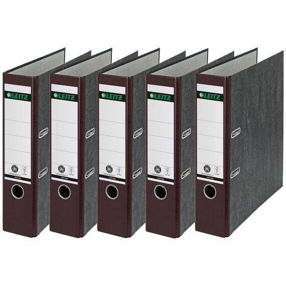 Leitz Qualitäts-Ordner, das Original, DIN A4 Aktenordner 8 cm breit, Wolkenmarmor-Papier, Recycling-Ordner, Blauer Engel, Mit 180° Mechanik, Höchste Stabilität (Breit, Braun, 5 Stück)