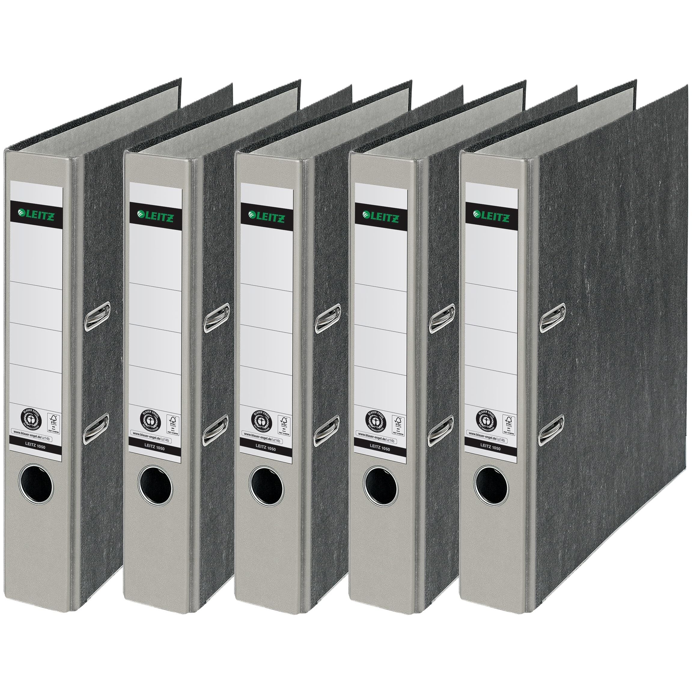 Leitz Qualitäts-Ordner, das Original, DIN A4 Aktenordner 8 cm breit, Wolkenmarmor-Papier, Recycling-Ordner, Blauer Engel, Mit 180° Mechanik, Höchste Stabilität (Schmal, Grau, 5 Stück)