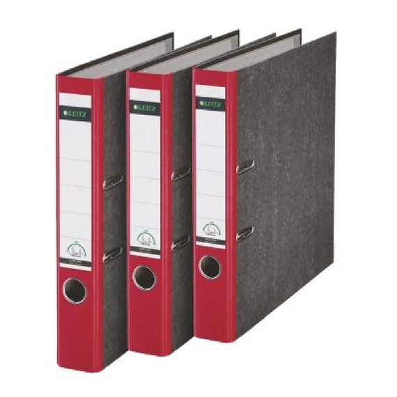 Qualitäts-Ordner 180A, mit patentierter 180º-Präzisionsmechanik. 5 Jahre Garantie. 50% weitere Mechaniköffnung für schnelleres und komfortableres Arbeiten. Ablegen auch auf der linken Seite möglich. GS-geprüft. Mit Schlitzen, mit Griffloch, mit Kantenschutz, mit Deckblatt, mit aufgeklebtem Rückenschild. Material: Einband aus Pappe (RC), mit Wolkenmarmorpapier (RC) kaschiert. Rücken mit farbigem Spezialpapier verstärkt. Format: für A4, 318 x 285 mm, Rückenbreite: 52 mm. Inhalt: 3 Stück. Farbe: rot.