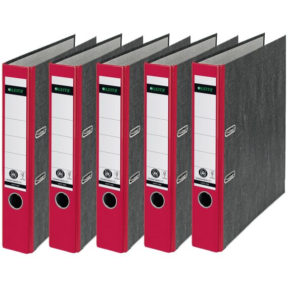 Leitz Qualitäts-Ordner, das Original, DIN A4 Aktenordner 8 cm breit, Wolkenmarmor-Papier, Recycling-Ordner, Blauer Engel, Mit 180° Mechanik, Höchste Stabilität (Schmal, Rot, 5 Stück)