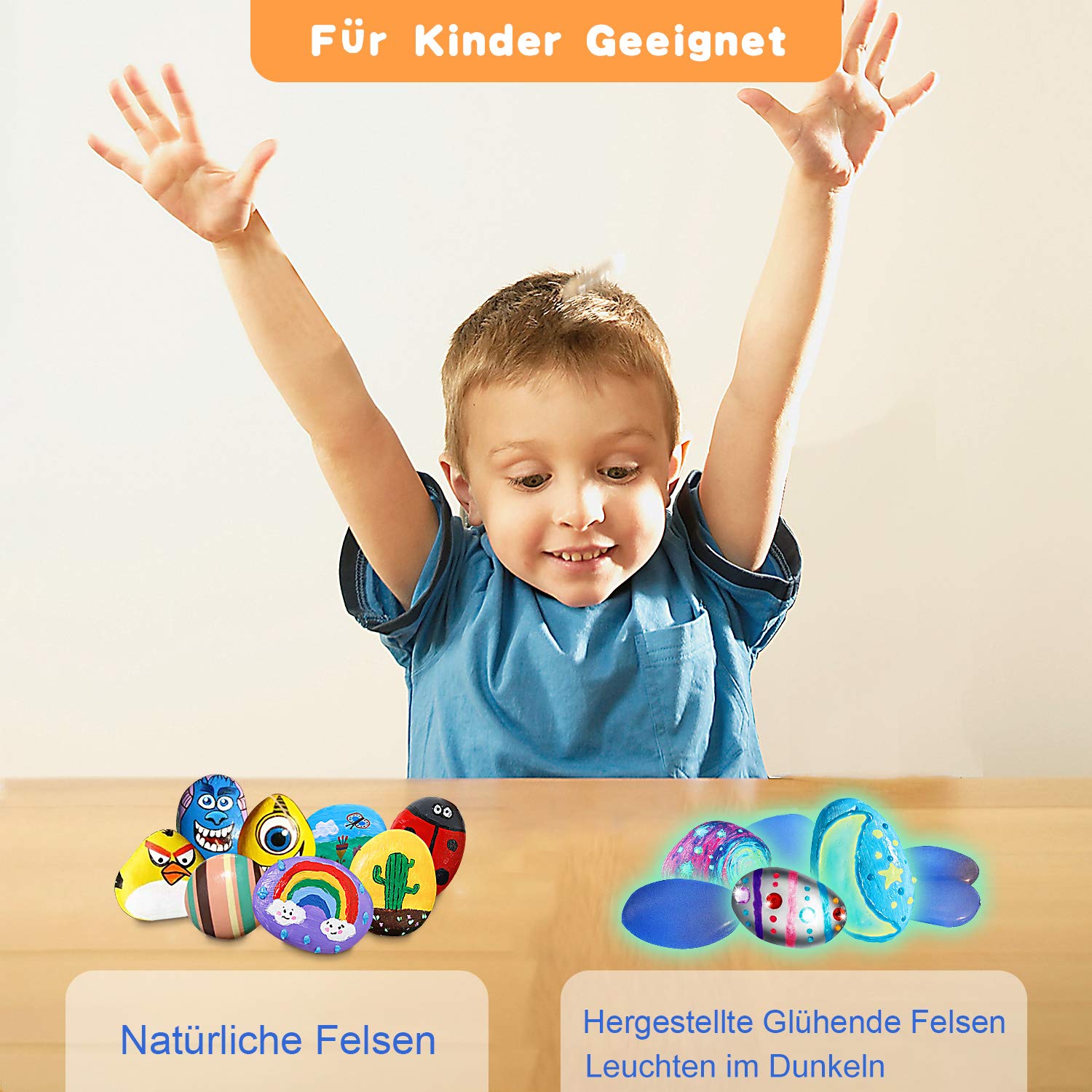 Modernes Design Es ist ein All-in-One Steine Bemalen Set, und wir bieten 6 manufacutured leuchtende Felsen, Kinder Schürze, Ärmel, die sich von anderen verwandten Produkten sind. Felsenmalerei ist Bastelset Kinder. Mädchen und Jungen werden viel Spass beim Malen haben und sich mit diesen Bastelsets ausdrücken können. Sie werden stolz darauf sein, ihre Kreationen zu Hause auszustellen oder sie als "Haustier-Felsen" zu behalten. Setzen Sie die bemalten Felsen einfach der Sonne aus und beobachten Sie, wie sie im Dunkeln leuchten. Alle unsere Produkte können die Gesundheit und Sicherheit bestätigen. Sie können es sicher kaufen und verwenden, jede Farbe ist einfach zu malen. Acryl-Pigmente sind nicht wasserdicht, können Sie die fertigen Felsen mit Wasser für wiederholte Verwendung waschen