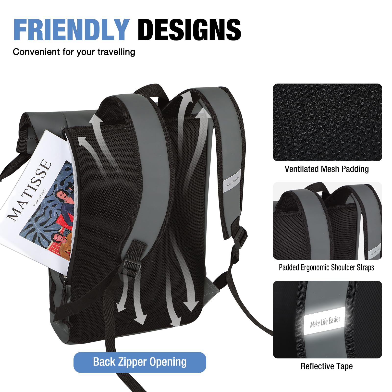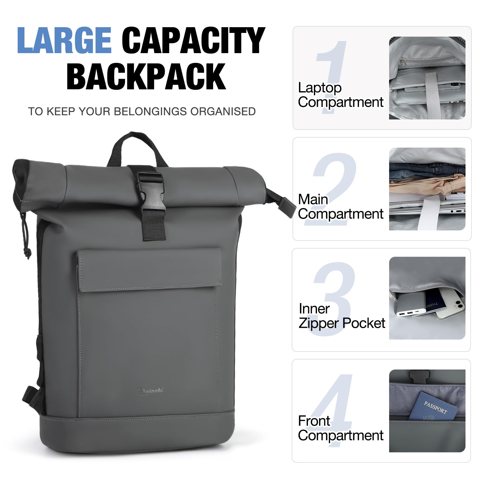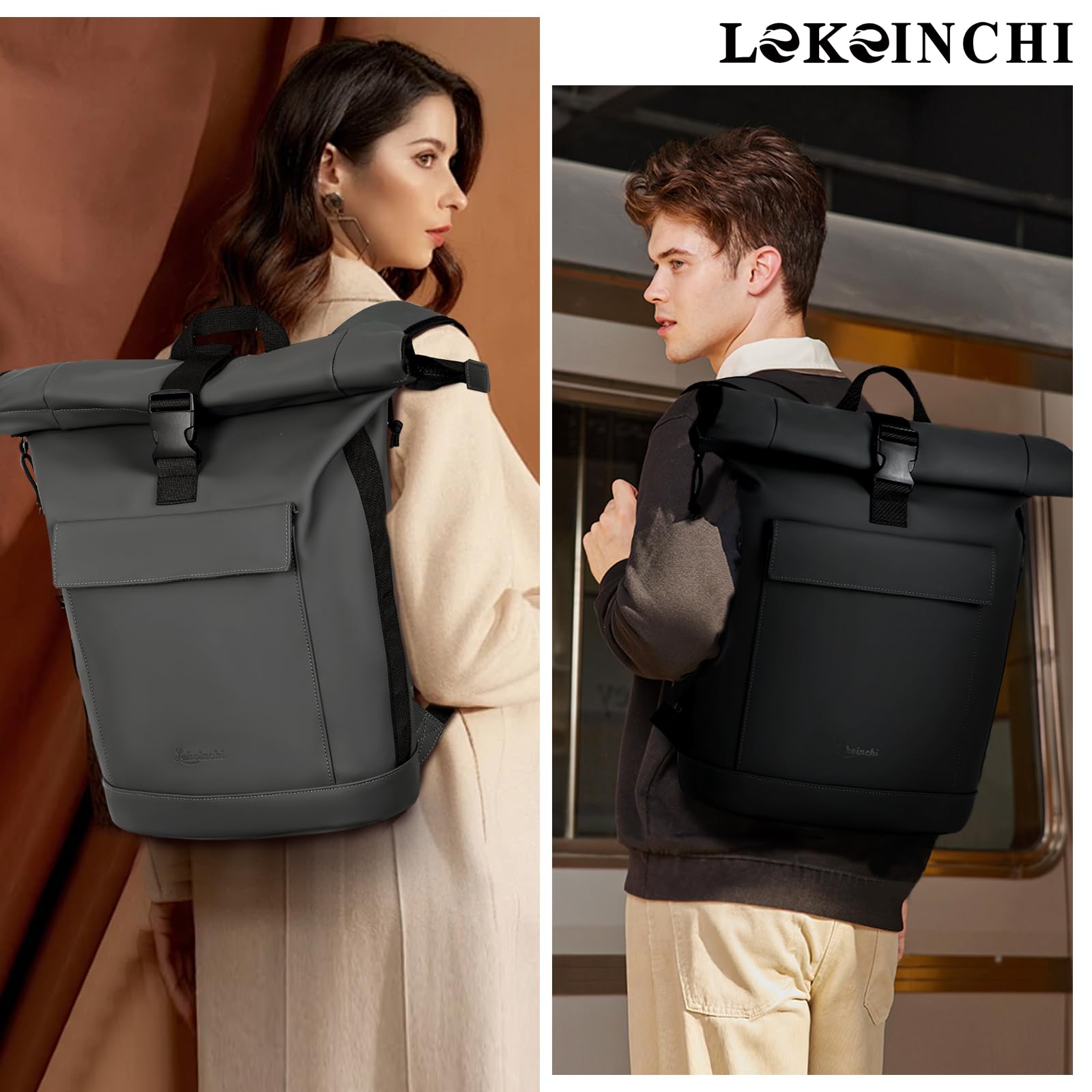 Lekeinchi Rolltop Rucksack Damen & Herren, Elegant Laptop Rucksack Wasserdicht mit 17 Zoll Laptopfach, Grosser Reiserucksack Tagesrucksack Schulrucksack für Reisen, Uni Schule, Arbeit - Grau