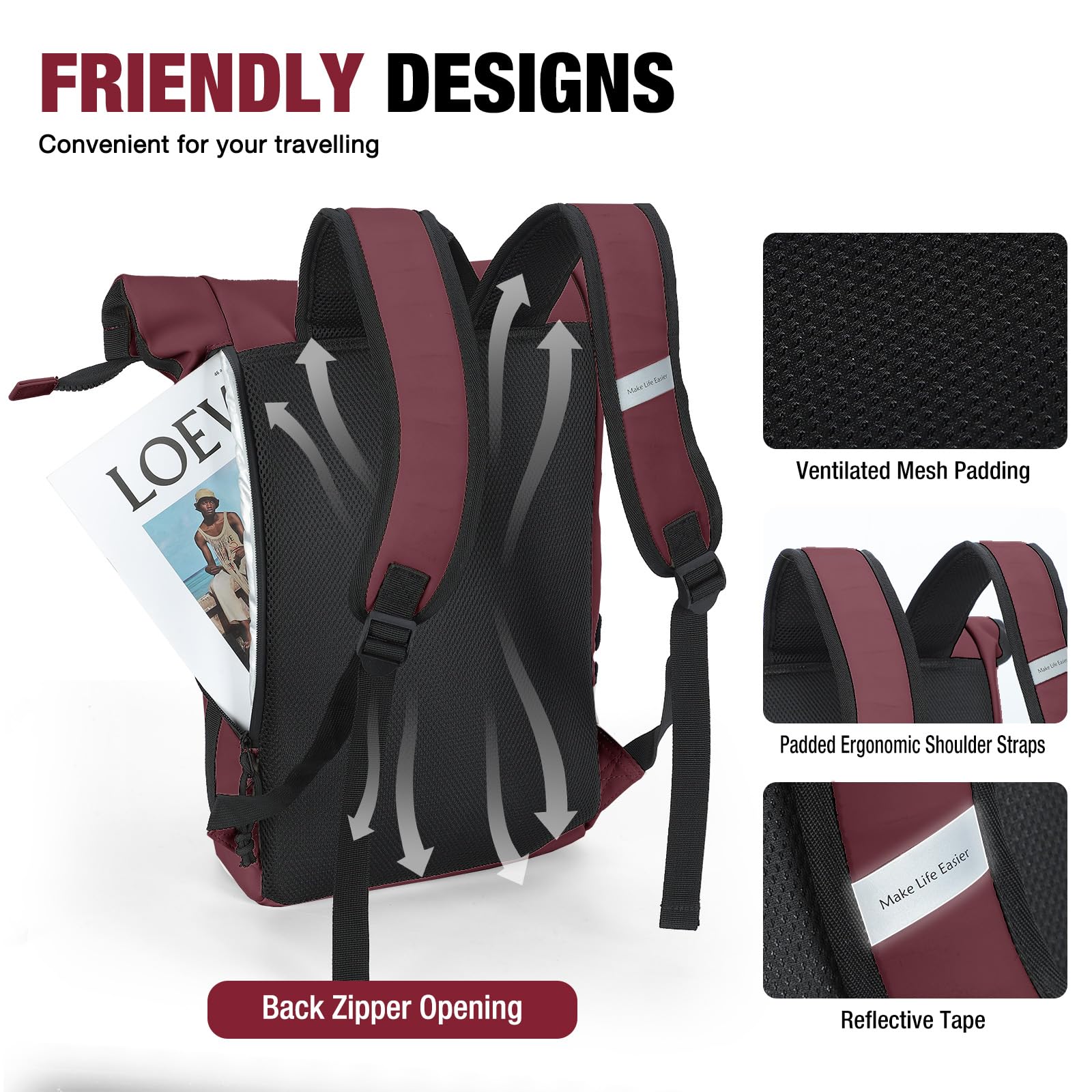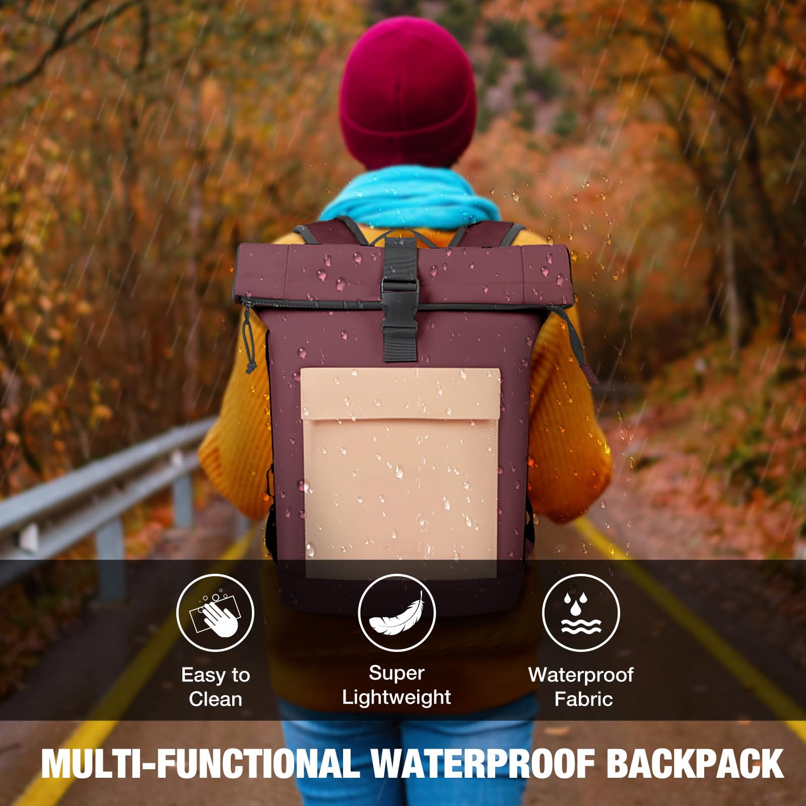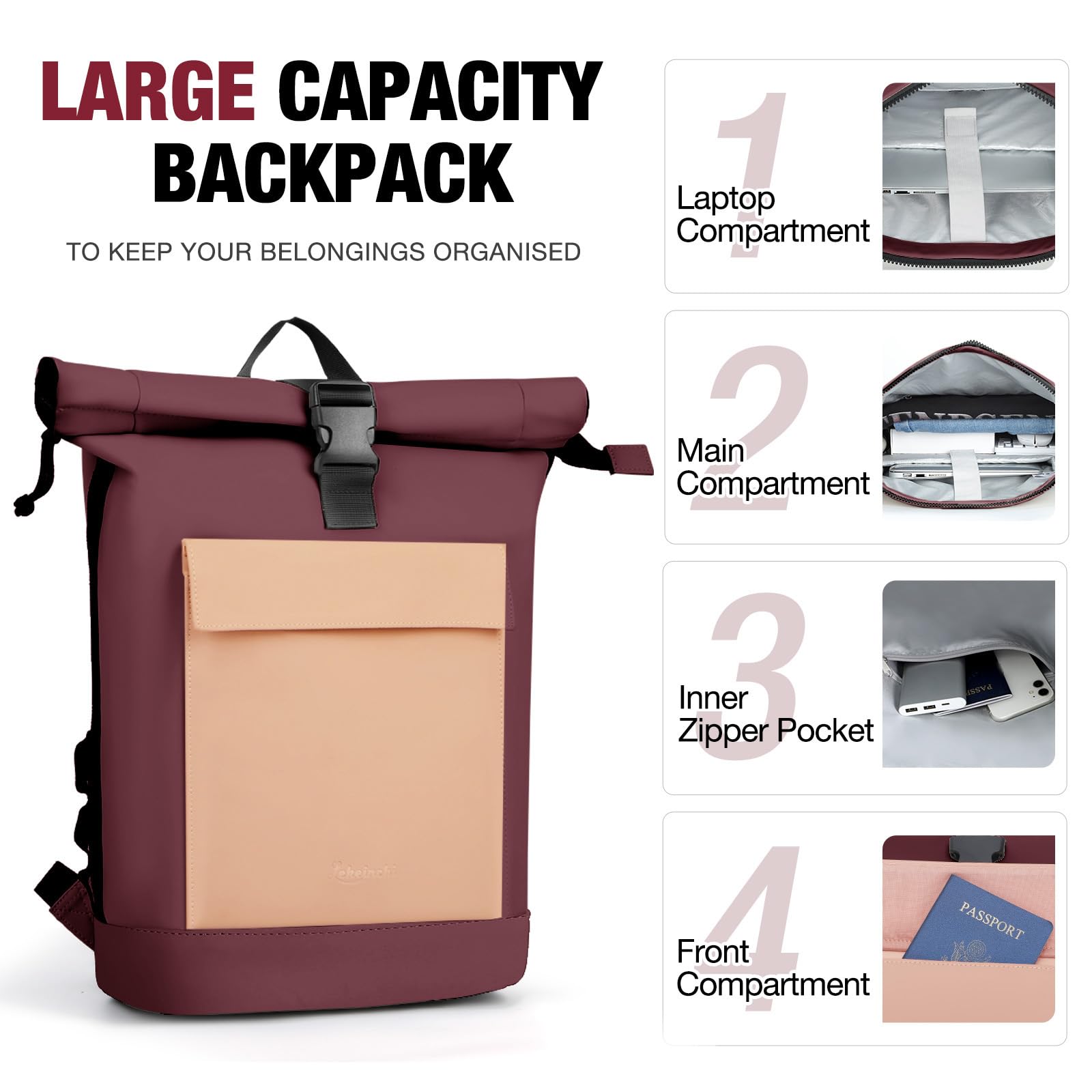Lekeinchi Rolltop Rucksack Damen & Herren, Elegant Laptop Rucksack Wasserdicht mit 17 Zoll Laptopfach, Grosser Reiserucksack Tagesrucksack Schulrucksack für Reisen, Uni Schule, Arbeit - Rotwein