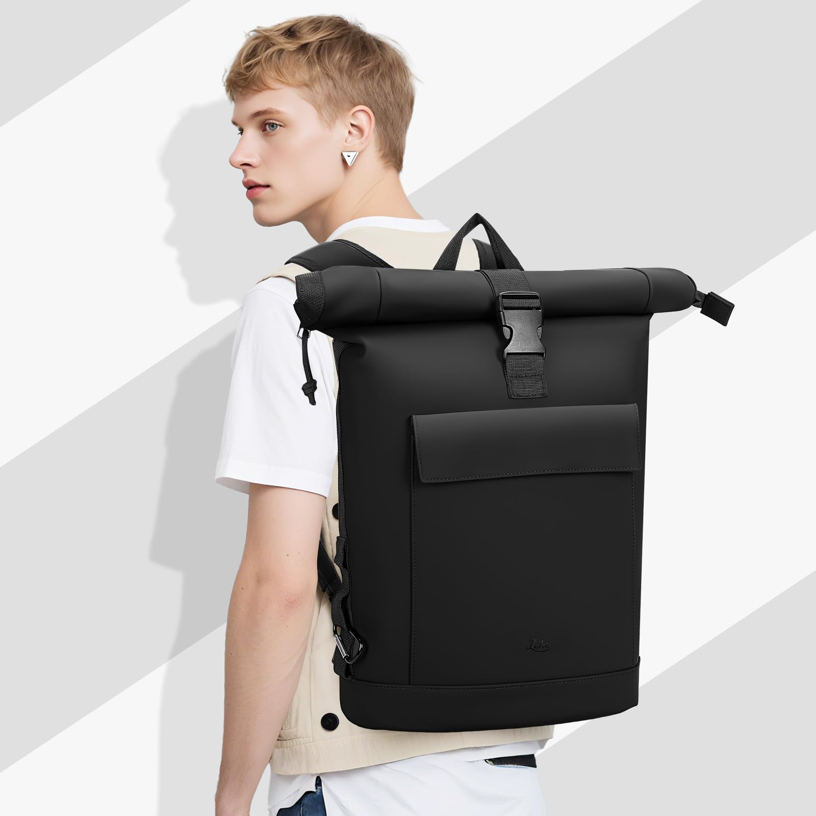 Lekeinchi Rolltop Rucksack Damen & Herren, Elegant Laptop Rucksack Wasserdicht mit 17 Zoll Laptopfach, Grosser Reiserucksack Tagesrucksack Schulrucksack für Reisen, Uni Schule, Arbeit - Schwarz_XL