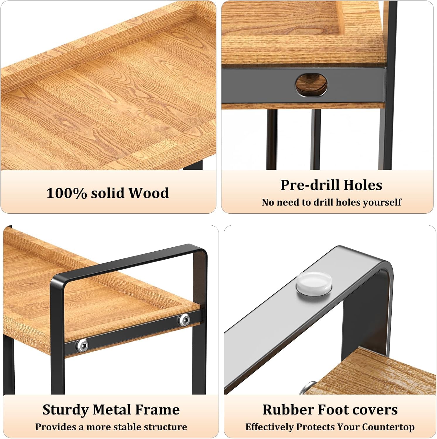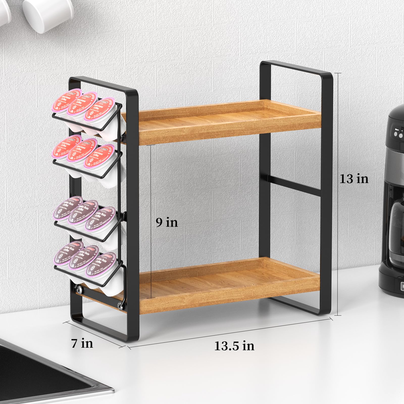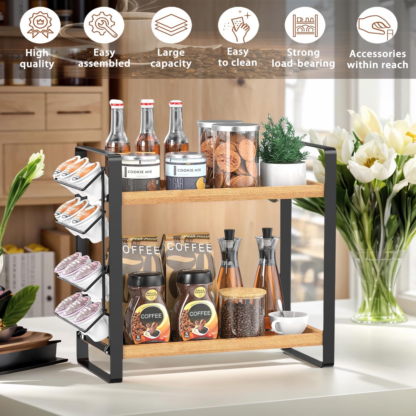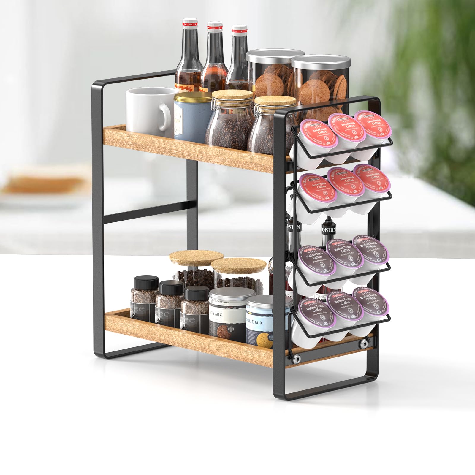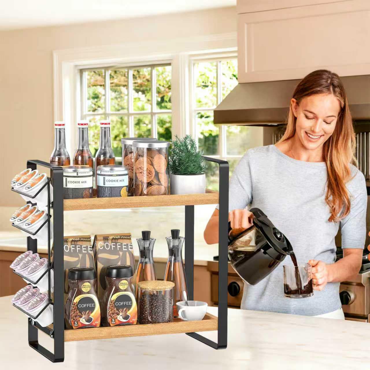 Die clever angeordneten Ablageflächen eignen sich ideal als Gewürzregal-Organizer oder zur Aufbewahrung von Kaffeezubehör wie Dosen, Gläsern und kleinen Maschinenaccessoires. So bleibt die Küche strukturiert und der Arbeitsbereich frei.