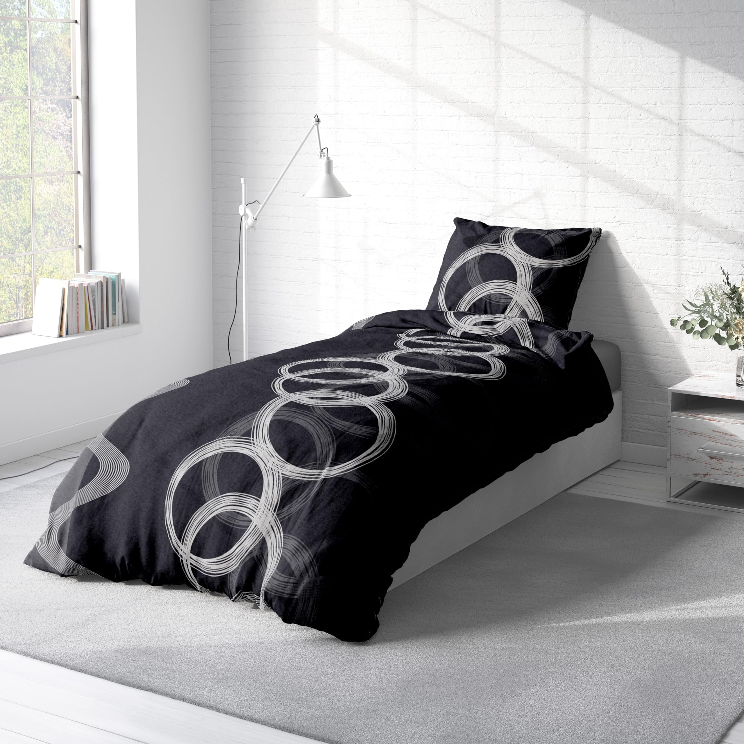 Leonado Vicenti Winter Bettwäsche Thermo Fleece Flausch Kuschelig Warme Garnitur Bettbezüge Set, Grösse:4 teilig 155x220 cm, Farbe:Kreise schwarz grau