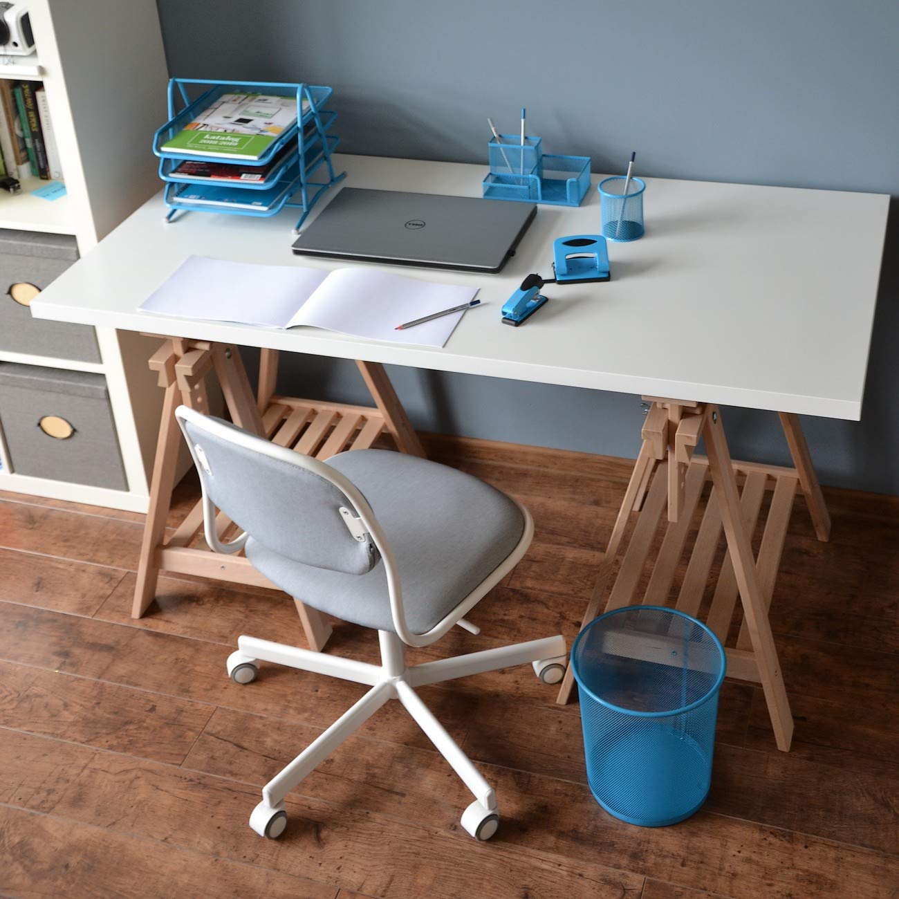 Mit diesem Schreibtisch-Organizer aus Metall halten Sie Ihren Arbeitsplatz in Ordnung. 3 Fächer: 1 Fach für Schreibzubehör, 1 Zettelbox und 1 Fach für kleineres Bürozubehör wie Büroklammern, Haftstreifen, Pagemarker, Korrekturroller. Spezielle Gummifüsse auf der Unterseite verhindern ein Zerkratzen der Schreibtischplatte. Aus Metallgeflecht, blau lackiert. Es kann ein komplettes Schreibtischset aus Stifteköcher, Schreibtisch-Organizer, Papierkorb, Brief- und Dokumentenablage, Hefter und Locher in einheitlicher Farbgebung zusammengestellt werden.