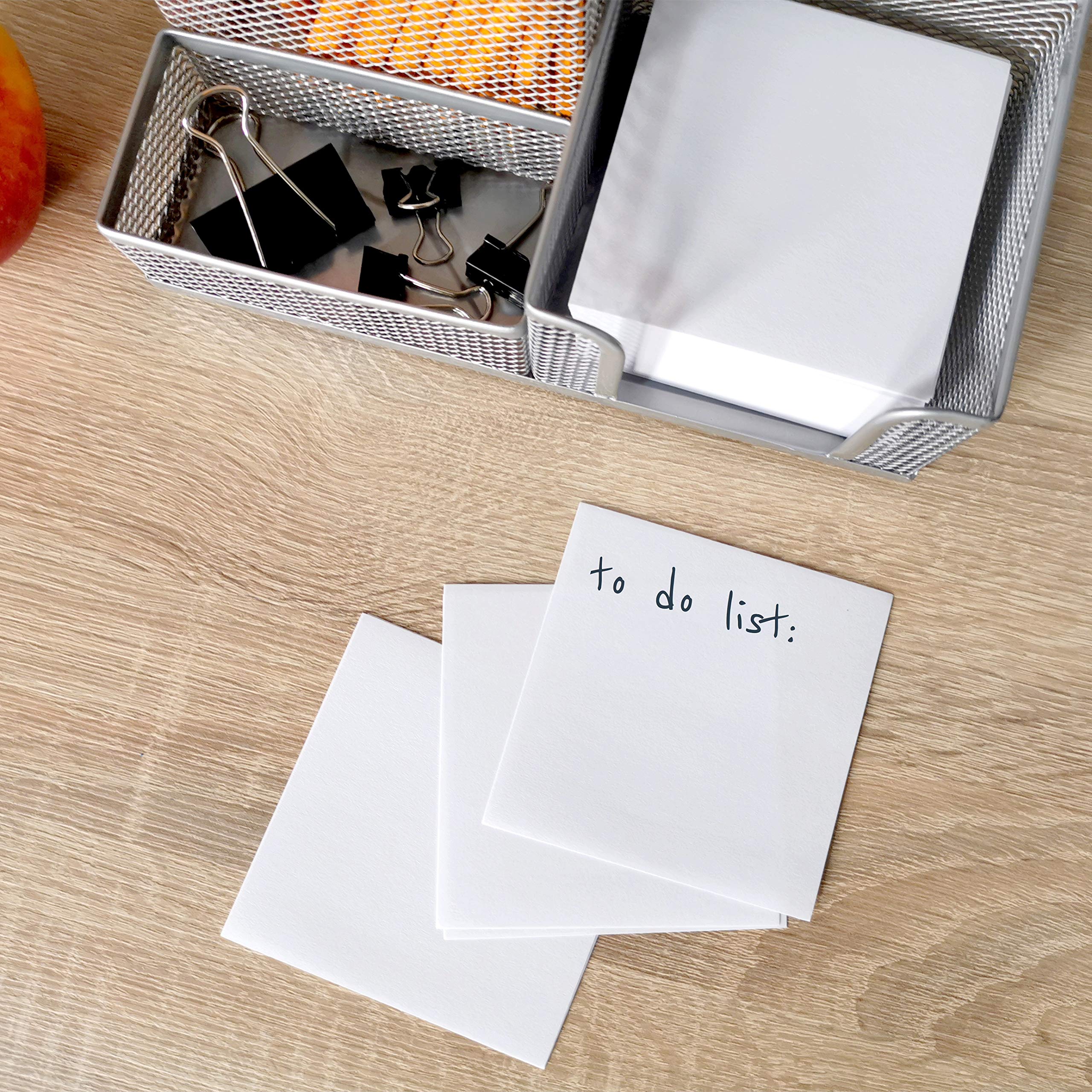 Mit diesem Schreibtisch-Organizer aus Metall halten Sie Ihren Arbeitsplatz in Ordnung. 3 Fächer: 1 Fach für Schreibzubehör, 1 Zettelbox und 1 Fach für kleineres Bürozubehör wie Büroklammern, Haftstreifen, Pagemarker, Korrekturroller. Spezielle Gummifüsse auf der Unterseite verhindern ein Zerkratzen der Schreibtischplatte. Aus Metallgeflecht, silberfarben lackiert. Es kann ein komplettes Schreibtischset aus Stifteköcher, Schreibtisch-Organizer, Papierkorb und Brief-/Dokumentenablage in einheitlicher Farbgebung zusammengestellt werden.