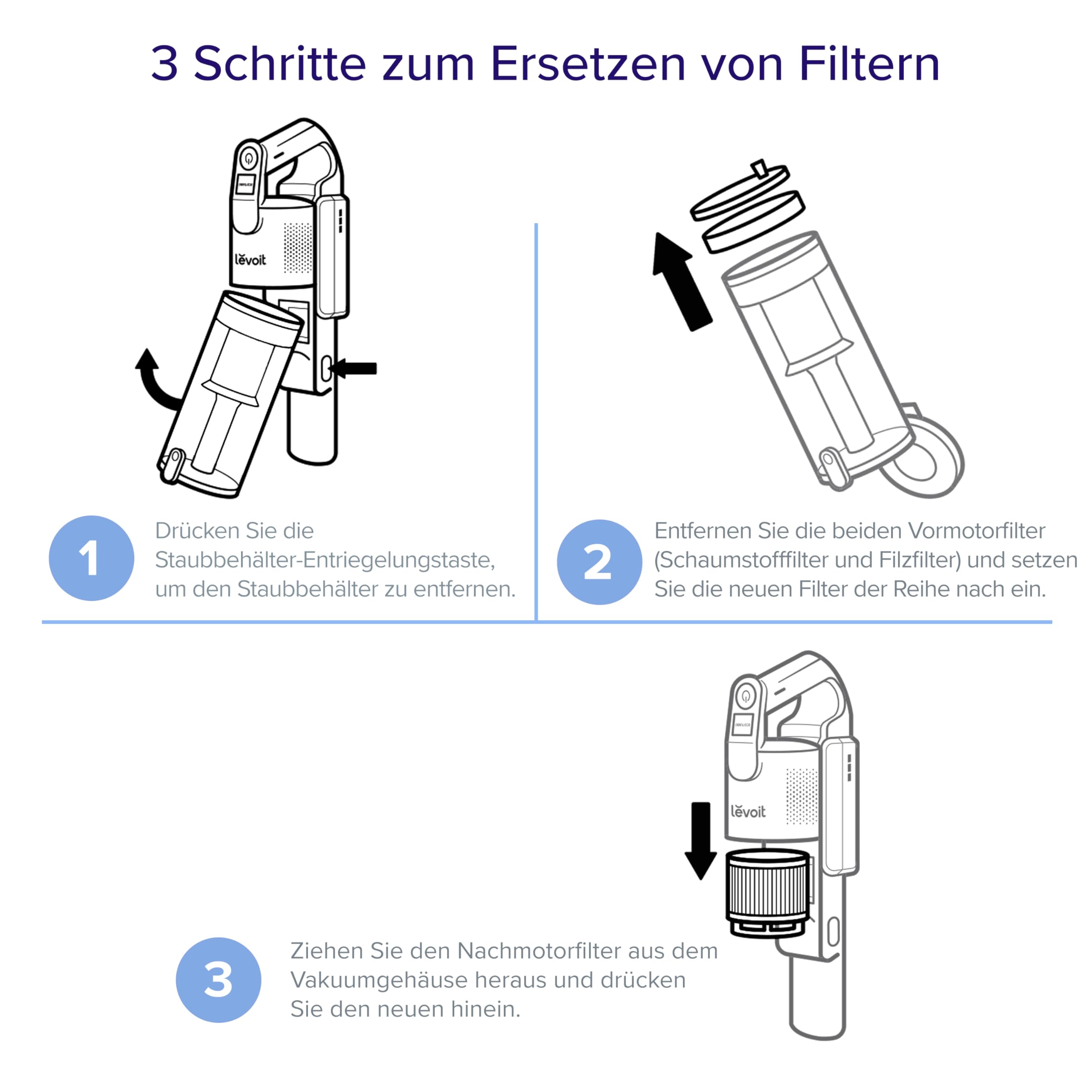 Damit die volle Staubsauger-Leistung erhalten bleibt, nur offizielle Levoit-Filter verwenden. Für weitere Informationen wenden Sie sich bitte an den Kundendienst