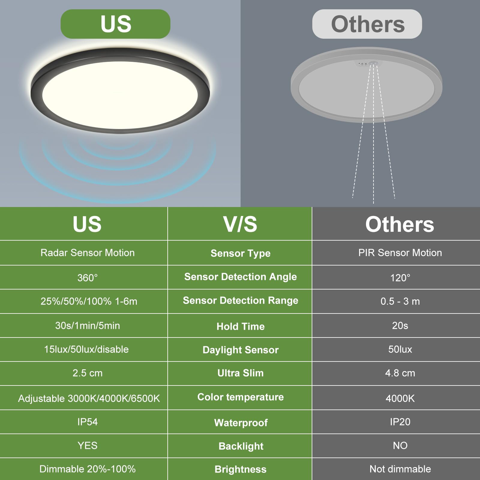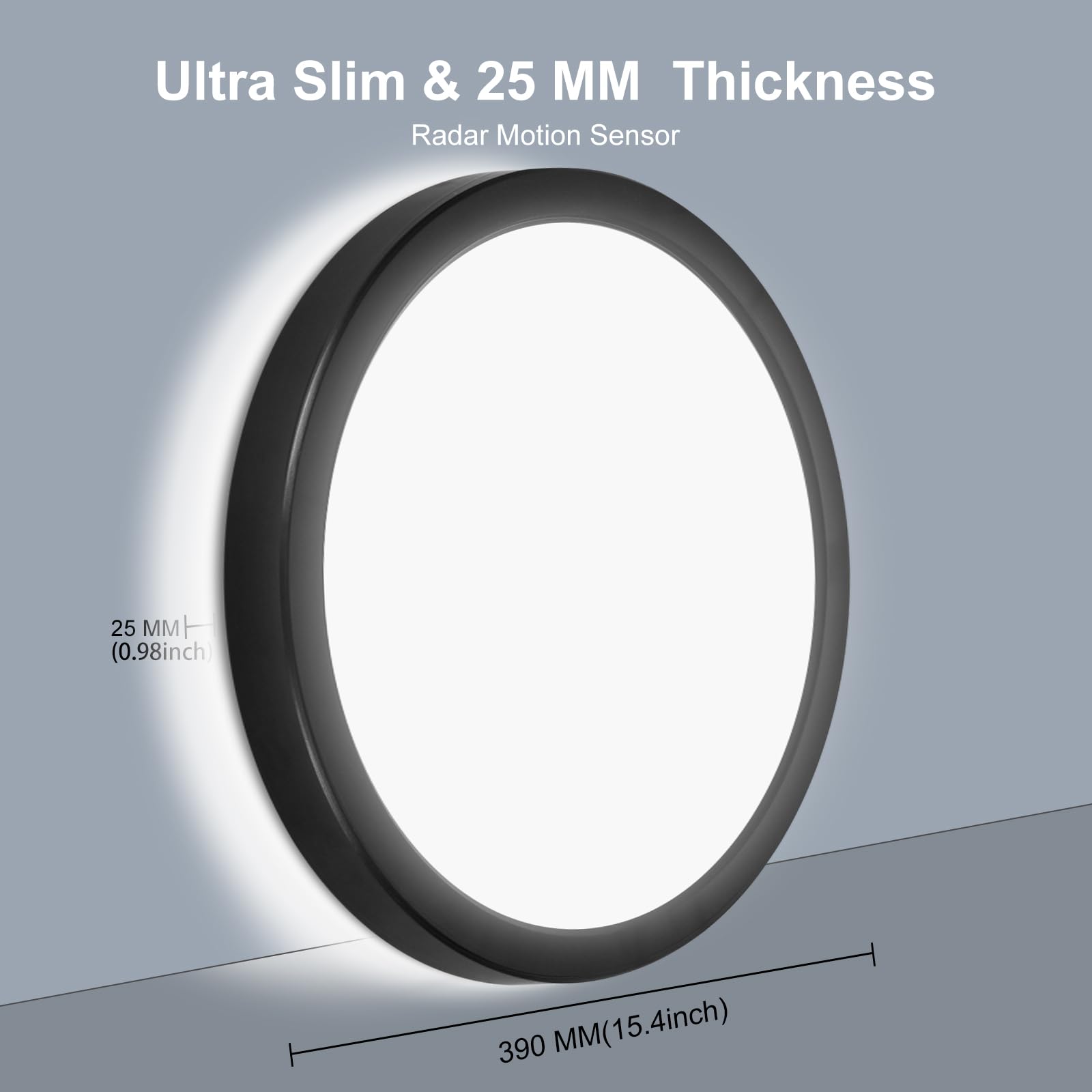 LED Deckenlampe Dimmbar mit Bewegungsmelder:Diese Dimmbar LED Deckenleuchte ist mit einem 5.8G Radar Bewegungsmelder und Lichtsensor ausgestattet. Diese Deckenlampe mit Bewegungsmelder schaltet sich sofort ein, wenn eine Bewegung innerhalb von einstellbar Erfassungsweite (1.5m/3m/6m ) erkannt wird, und wenn keine Bewegung erkannt wird, schaltet sich die Lampe nach einstellbare Haltezeiten (5s/30s/1min/5min) automatisch aus. Bewegungssensor einstellbar mit Fernbedienung:LED Deckenlampe können je nach Bedarf verschiedene Werte im Voraus einstellen. 1. Erfassungsweite: 25% Modus (1m Bis 1.5m) 50% Modus (2m Bis 3m) und 100% Modus (5m Bis 6m); 2. Lichtsensor: 15Lux/50Lux/DISABLE 3. Haltezeit: 30S/1MIN/5MIN. Verschiedene Sensormodi:Sie können diese Sensor Deckenleuchte noch Ihrem Bedürfnis via Fernbedienung einstellen: 1. "ON" Mode ohne Sensor: Drücken Sie "ON", Immer an als normal Lampe; 2. "Reset-Modus“: Drücken Sie "Reset", Das Sensor Licht bleibt (1,5m + 50Lux + 30s); 3. "Bewegungssensor + Lichtsensor": Diese lampe funktioniert tagsüber nicht, kann nur Nachts durch Bewegung aktiviert werden; 4. "Nur Bewegungssensor": Lichtsensor Disable und Leuchte mit Bewegungsmelder funktioniert ganztägig. Einstellbare Farbtemperatur: Sie können diese Sensor Deckenlampe auch mit Fernbedienung auf warmweiss 3000K, naturweiss 4000K, kaltweiss 6500K einstellen; Sie können die Farbtemperatur von dieser Flach Deckenleuchte nach verschiedenen Szenen und Bedürfnis anpassen.