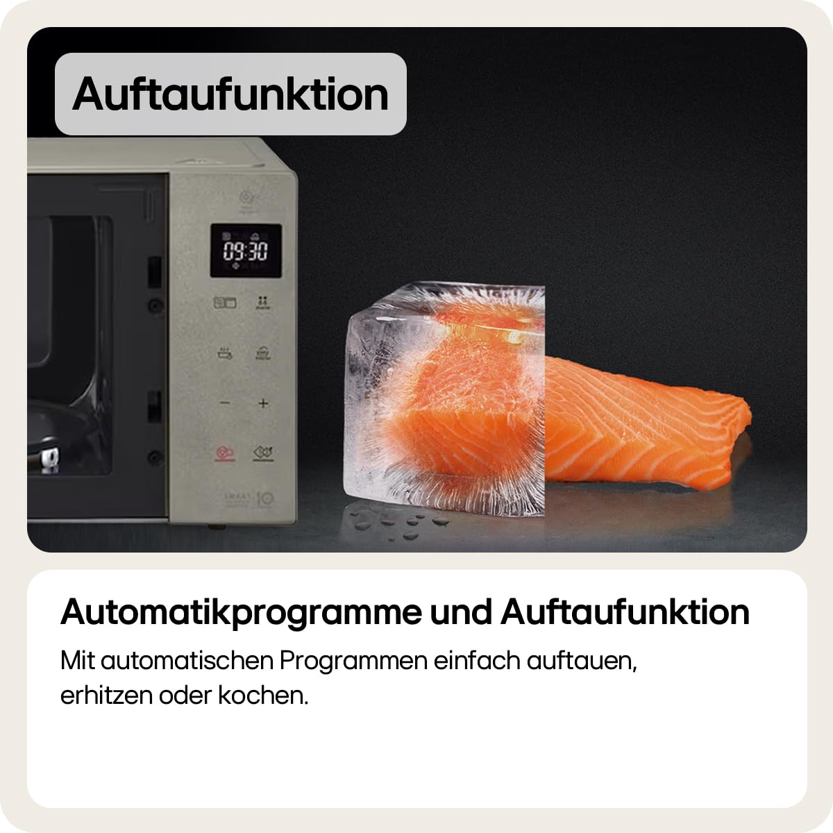 Bedienung : Touch Bedienfeld mit Digitaldisplay Technische Besonderheiten : Smart Inverter Technologie (präzise Leistungssteuerung mit 10 Jahren auf das Smart Inverter Magnetron) i-Wave (gleichmässige Erwärmung des Gargutes durch dreidimensiole Mikrowellen) Quarz Grill (effektiver und schneller als ein konventioneller Grill) Technische Ausstattung: Schnellauftau-Funktion Antibakteriell beschichteter Innenraum mit Easy Cleaning Akustisches Sigl bei Programmende Kindersicherung Energiesparmodus Eco On (reduziert im Standby den Energieverbrauch der Displayanzeige per Knopfdruck) Programme: Sechs autom. Röstprogramme 4 autom. Aufweich- und Schmelzprogramme Zwei Warmhalteprogramme Vier autom. Auftauprogramme Acht autom. Programme mit Gewichtsautomatik Zubehör: Rost Glasdrehteller.