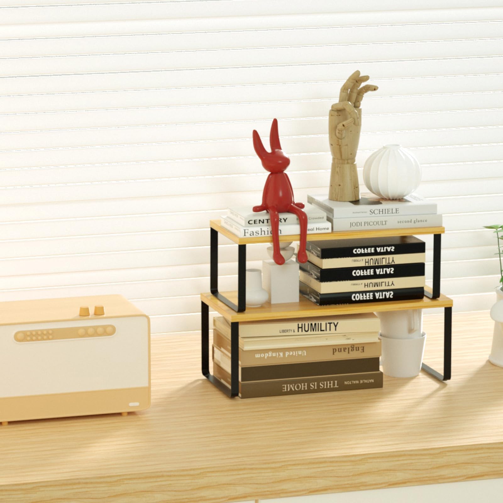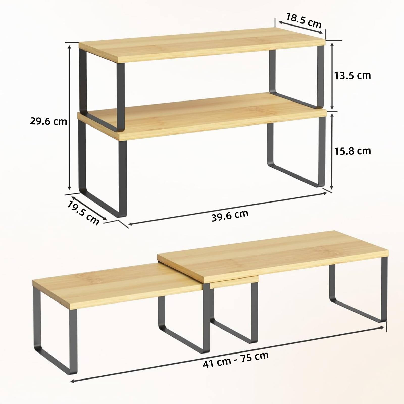 Unser 4er-Set Küchenregal-Organizer von LIANTRAL bietet Ihnen die beste Qualität. Längen- und höhenverstellbare Küchenregale sorgen für Ordnung in jedem Zuhause. Technische Daten: Grosses Regal: 19,5 cm T x 39,6 cm B x 15,5 cm H. Kleines Regal: 18,5 cm T x 39,6 cm B x 13,5 cm H. Die Grösse der gestapelten Regale: 19,5 cm T x 39,6 cm B x 29,7 cm H. Maximale Erweiterung des Gestells: 41-75,3 cm. Material: Metall und Bambus. Farbe: Natur und Schwarz. Gewicht: 3,58 kg. Paket beinhaltet:4 x Küchenregal Dieser Küchenregal Organizer ist Ihre perfekte Wahl. Einfaches Sortieren der Gewürze, Tassen und Schalen in der Küche und im Bürobedarf wie Hefter, Clips, Bücher im Büro. Hohe Qualität: Hergestellt aus massivem Bambus und stabilem Metallregal, exquisite Struktur und robuste Materialien sorgen dafür, dass diese Gewürzregale stabil und langlebig sind, was den Verbrauchern hilft, Schränke besser zu organisieren und Platz zu sparen. Stabil und stabil: 【Statische Tragfähigkeit jedes Regals】 15 kg, bieten genug Stauraum, um die Nutzung von Schränken und Arbeitsplatten zu maximieren, bequem Tassen, Gewürzflaschen, Teller, Geschirr zu organisieren. Warme Tipps: 1. Beachten Sie die Anweisungen für Stapelinformationen. 2. Vermeiden Sie den langfristigen Gebrauch in feuchter Umgebung. 3. Die Beine des Schrankregals können während des Liefervorgangs verbogen oder beschädigt werden. Wenn Sie eines der oben genannten haben, teilen Sie uns dies bitte mit! 4. Es ist nicht ratsam, zu schwere Dinge zu platzieren.