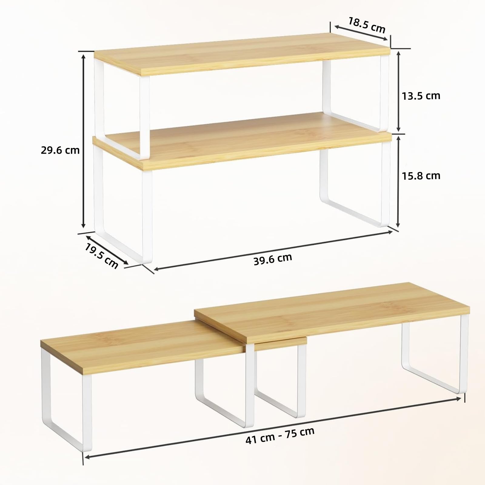 Unser 4er-Set Küchenregal-Organizer von LIANTRAL bietet Ihnen die beste Qualität. Längen- und höhenverstellbare Küchenregale sorgen für Ordnung in jedem Zuhause. Technische Daten: Grosses Regal: 19,5 cm T x 39,6 cm B x 15,8 cm H. Kleines Regal: 18,5 cm T x 39,6 cm B x 13,5 cm H. Die Grösse der gestapelten Regale: 19,5 cm T x 39,6 cm B x 29,7 cm H. Maximale Erweiterung des Gestells: 41-75,3 cm. Material: Metall und Bambus. Farbe: Natur und Weiss. Gewicht: 3,58 kg. 【Paket beinhaltet】 4 x Küchenregale, 1 x Kreuzschlitzschraubendreher. Dieser Küchenregal Organizer ist Ihre perfekte Wahl. Einfaches Sortieren der Gewürze, Tassen und Schalen in der Küche und im Bürobedarf wie Hefter, Clips, Bücher im Büro. Hohe Qualität: Hergestellt aus massivem Bambus und stabilem Metallregal, exquisite Struktur und robuste Materialien sorgen dafür, dass diese Gewürzregale stabil und langlebig sind, was den Verbrauchern hilft, Schränke besser zu organisieren und Platz zu sparen. Stabil und stabil: 【Statische Tragfähigkeit jedes Regals】 15 kg, bieten genug Stauraum, um die Nutzung von Schränken und Arbeitsplatten zu maximieren, bequem Tassen, Gewürzflaschen, Teller, Geschirr zu organisieren. Warme Tipps: 1. Beachten Sie die Anweisungen für Stapelinformationen. 2. Vermeiden Sie den langfristigen Gebrauch in feuchter Umgebung. 3. Die Beine des Schrankregals können während des Liefervorgangs verbogen oder beschädigt werden. Wenn Sie eines der oben genannten haben, teilen Sie uns dies bitte mit! 4. Es ist nicht ratsam, zu schwere Dinge zu platzieren.
