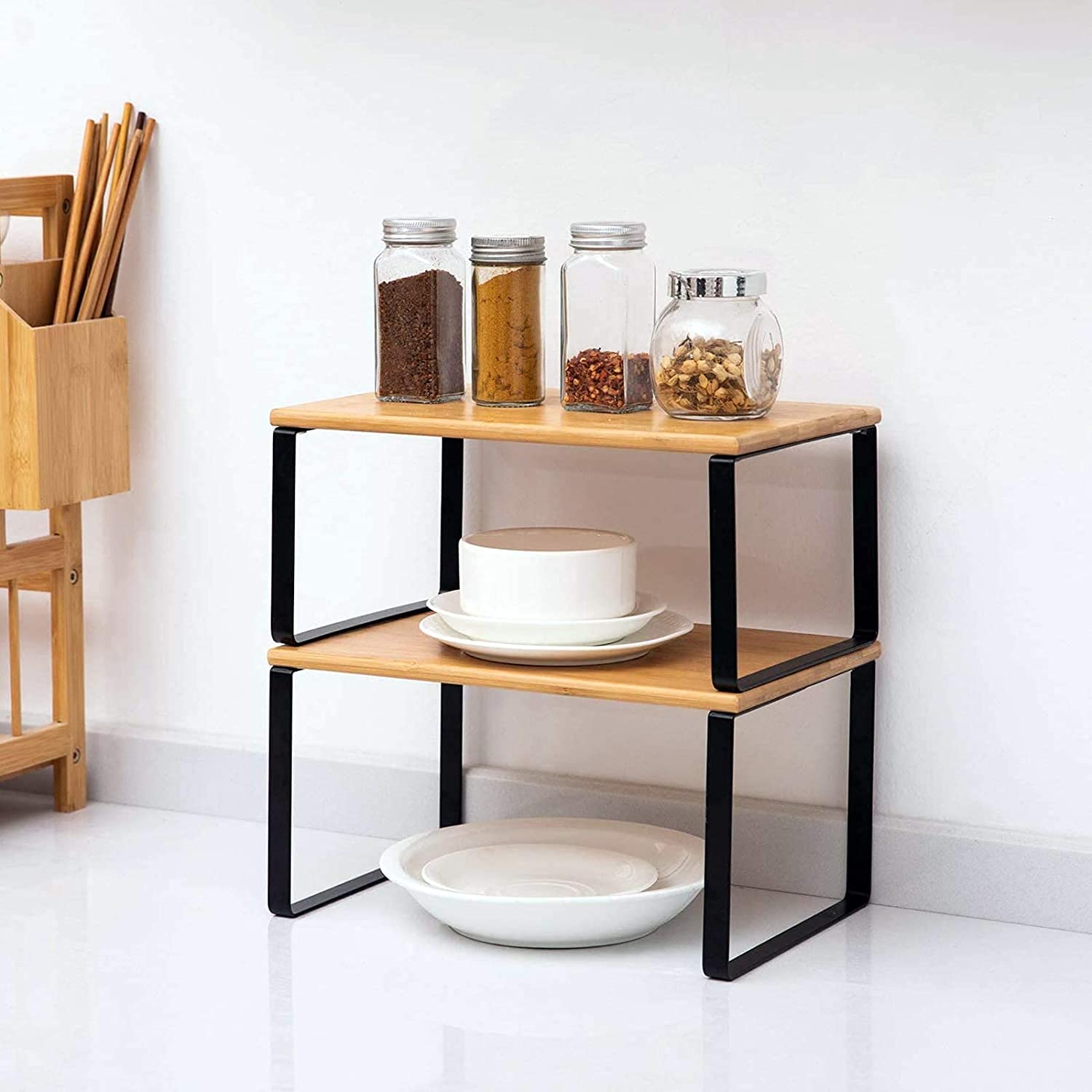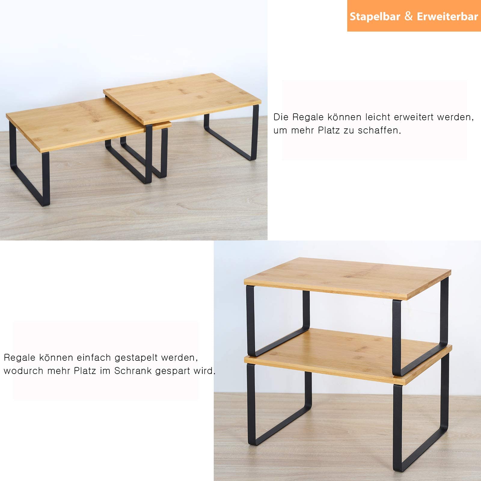 LIANTRAL Küchenschrank Organizer 4er-Set, Küchenregal, Küchen Organizer aus Metall und Bambus, Erweiterbar und Stapelbar Schrank-Organizer Gewürzregale, kleines Regal, Schwarz und Naturfarben