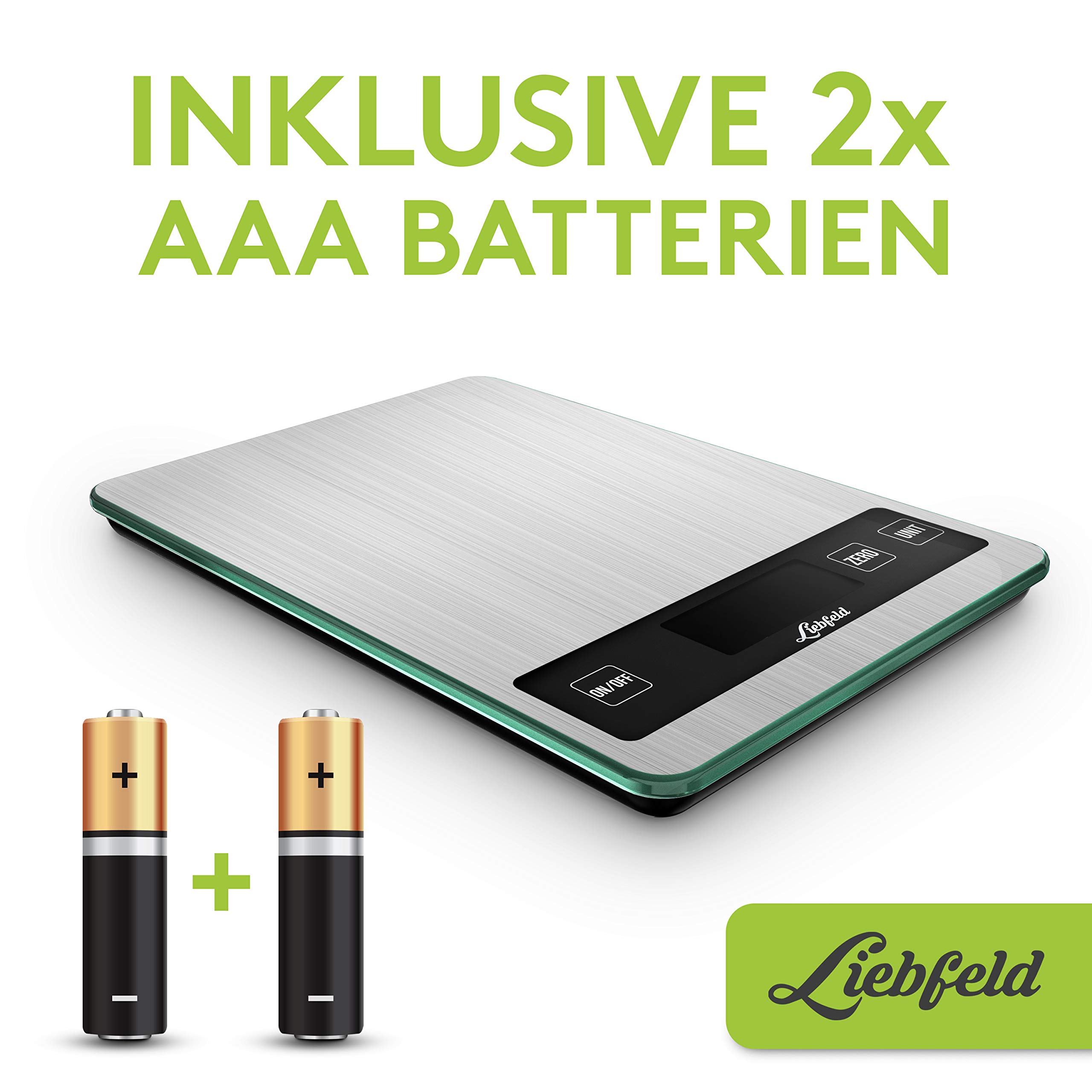 Liebfeld Küchenwaage Digital - Präzise Waage aus Edelstahl u. Glas mit grosser Wiegefläche bis 15kg - Beleuchtetes Display - Digitale Küchenwaage inkl. 2 AA Batterien - Küchen Zubehör