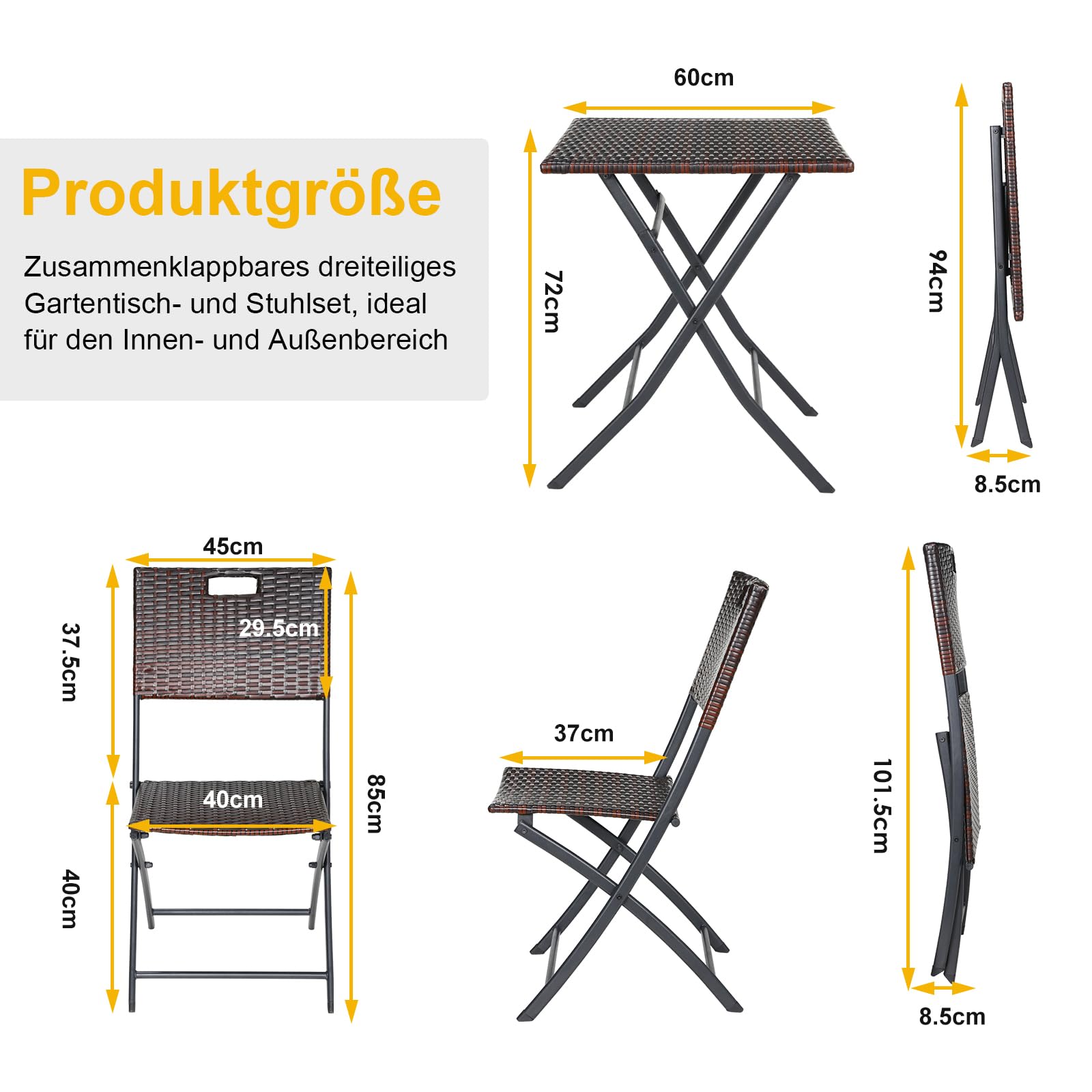 Keine Montage erforderlich: Das Balkonmöbel Set 3-teilige besteht aus einem klappbaren Tisch und zwei klappbaren Stühlen, wodurch Sie sich die Montageschritte sparen können, und es ist leicht und kann jederzeit an den gewünschten Ort verschoben werden.