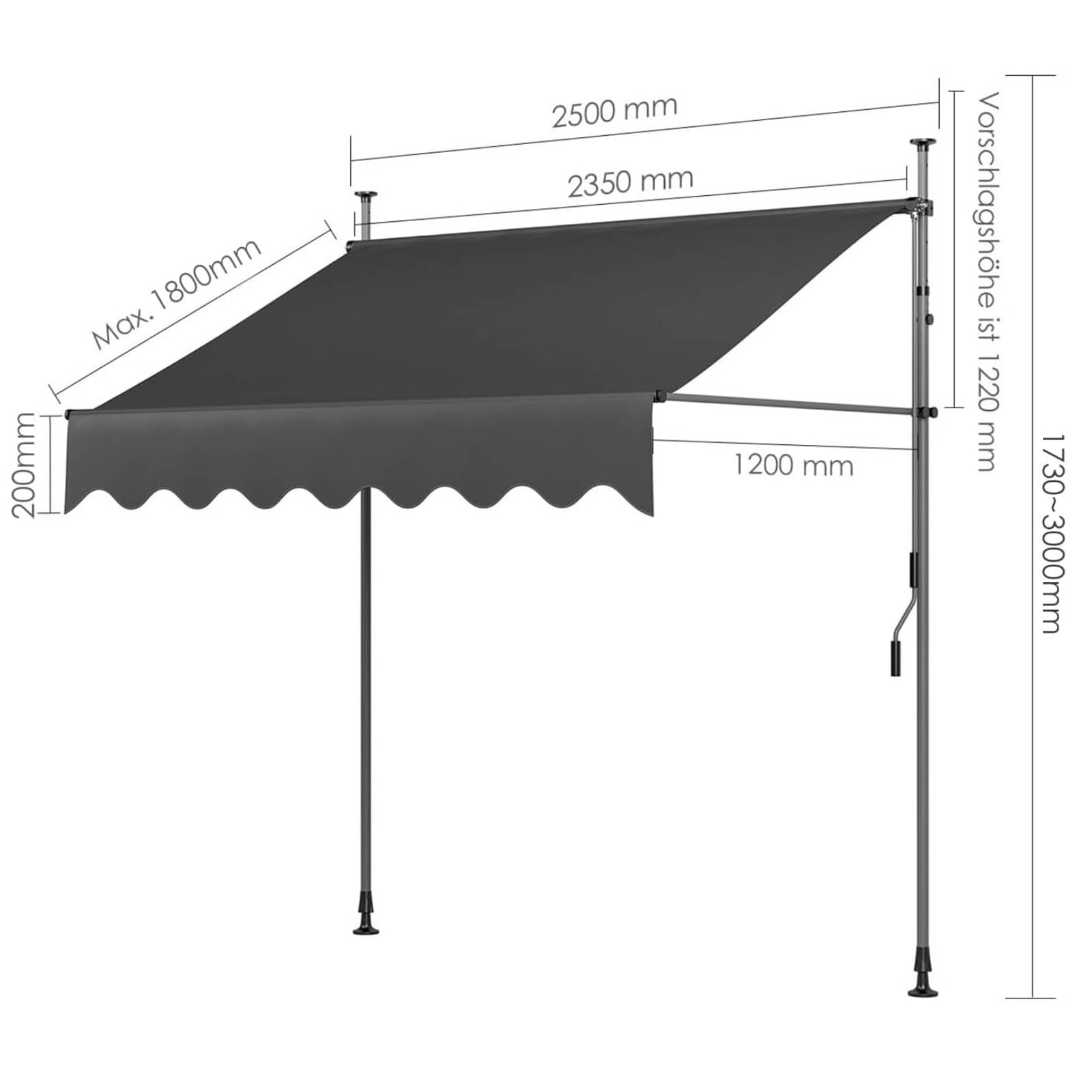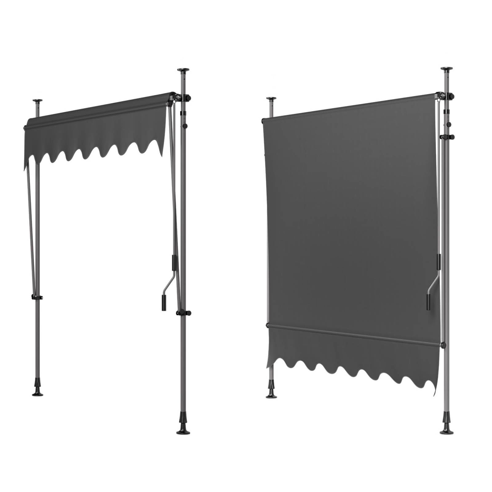 Geniessen Sie Ihren Balkon bei jedem Wetter – mit perfektem Schutz und stylischem DesignDie LIFERUN Klemmmarkise verwandelt Ihren Balkon oder Terrasse in eine gemütliche Wohlfühlzone. Sie bietet sofortigen Schutz vor intensiver Sonne und sommerlichen Regenschauern, sodass Sie die warme Jahreszeit in vollen Zügen draussen entspannen können. Das zeitlose Design fügt sich harmonisch in jede Aussenumgebung ein und unterstreicht die Ästhetik Ihres Zuhauses.Ihre Vorteile auf einen Blick:Schnelle, bohrfreie Montage: Einfaches Klemmen zwischen Boden und Decke – keine Beschädigung der Wände, ideal für Mieter.Perfekter Rundumschutz: Das robuste Polyestergewebe mit PU-Beschichtung ist 100% wasserdicht und blockiert UV-Strahlen effektiv für kühlenden Schatten.Einfache Handhabung: Praktische Handkurbel zum mühelosen Aus- und Einrollen. Die Höhe ist stufenlos von 173-300 cm einstellbar.Platzsparend: Zusammengeklappt extrem schmal für einfache Aufbewahrung.Technische Spezifikationen:Material Bezug: Hochwertiges Polyester mit PU-BeschichtungMaterial Gestell: Stabiles EisenrohrMaterial Aufroller: Aluminium-WalzeVerfügbare Farben: Grau, Khaki, Blau/Weiss gestreiftMontagehöhe (einstellbar): 173 – 300 cmLänge der Handkurbel: 125 cmMasse Bezugstuch (L x H): ca. 235 x 200 cmGesamtmasse (B x T x H): ca. 250 x 120 x 173-300 cmLieferumfang:1 x Klemmmarkise (inkl. Gestell)1 x InstallationsanleitungFlexibel das ganze Jahr: Diese Markise kann bei Bedarf ganzjährig aufgestellt bleiben oder im Winter einfach demontiert und platzsparend gelagert werden.