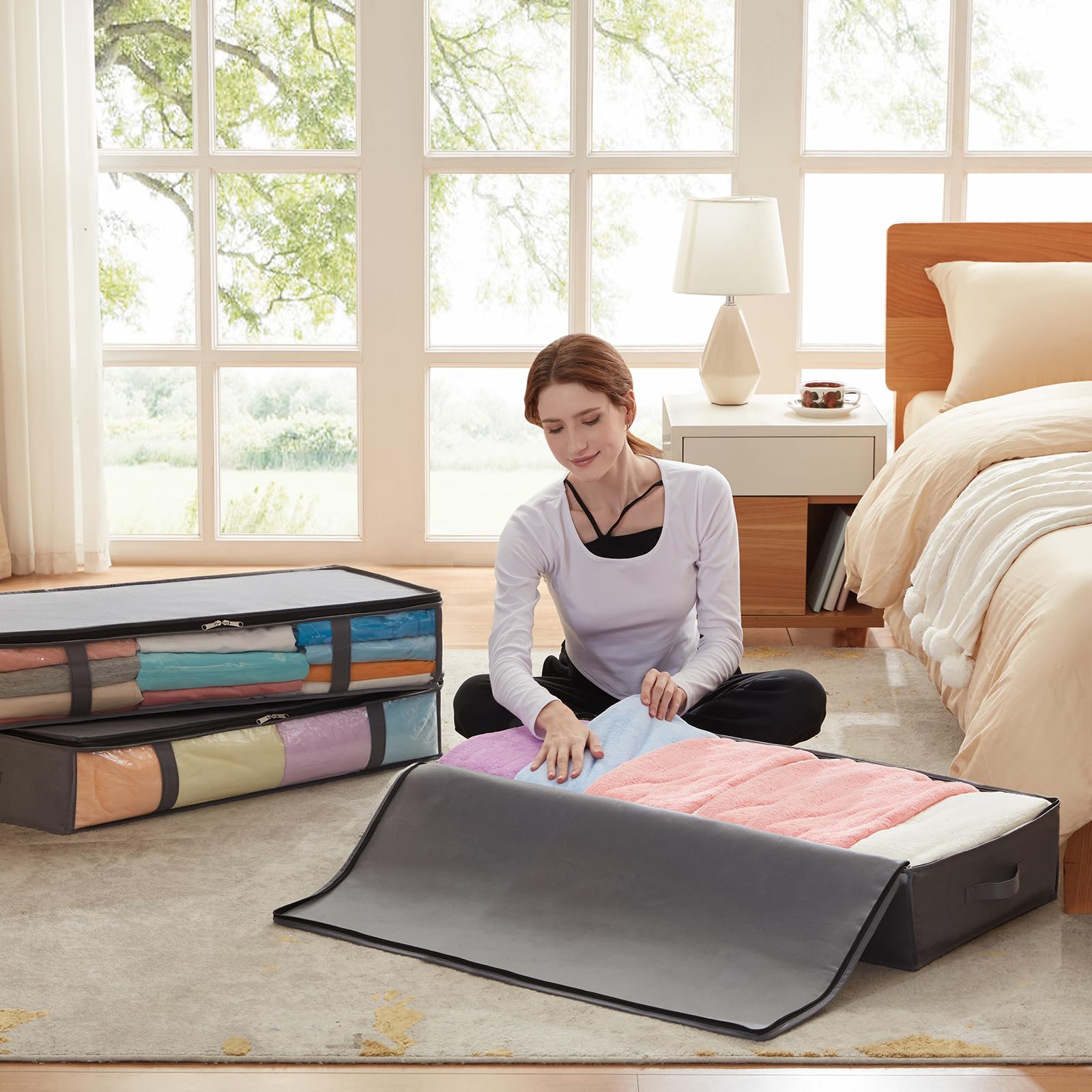 - Transparentes Fenster: Das transparente Sichtfenster der Unterbettboxen bietet eine hervorragende Sichtbarkeit und ermöglicht es Ihnen, auf einen Blick zu sehen, was sich im Inneren befindet, ohne Zeit zu verschwenden, indem Sie den Reissverschluss öffnen, um zu suchen. Bei Verschmutzung mit einem feuchten Tuch abwischen.