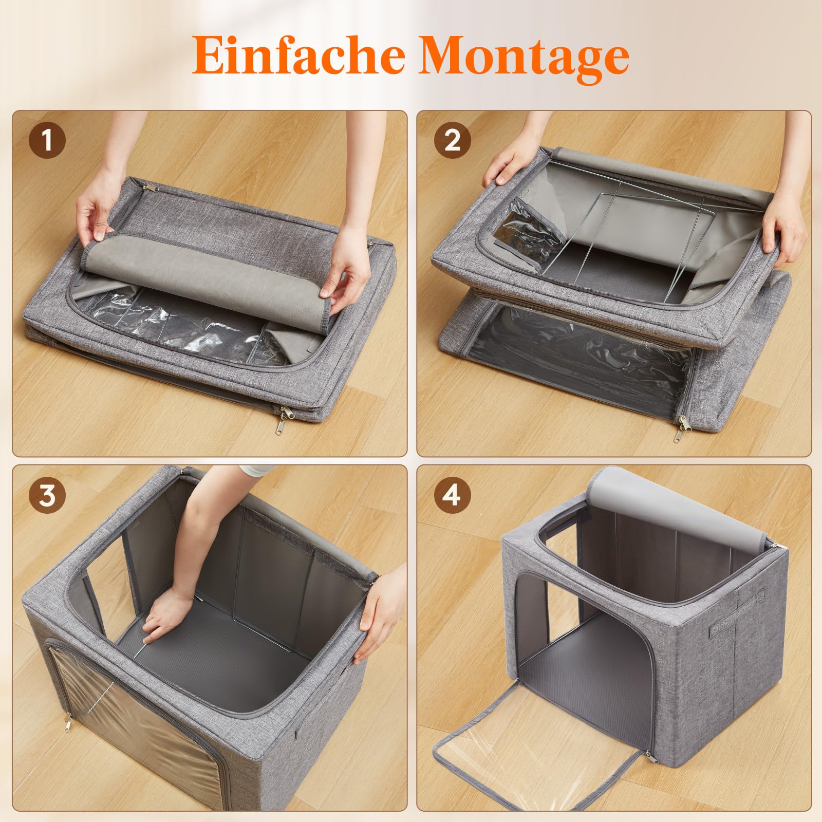 Lifewit 100L Aufbewahrungsbox mit Deckel, Kleidung Aufbewahrung, Faltbare Kleideraufbewahrung mit Metallrahmen, Stoffbox mit Griffen & Fenster, Aufbewahrung Kleiderschrank, 4er Set, Hellgrau
