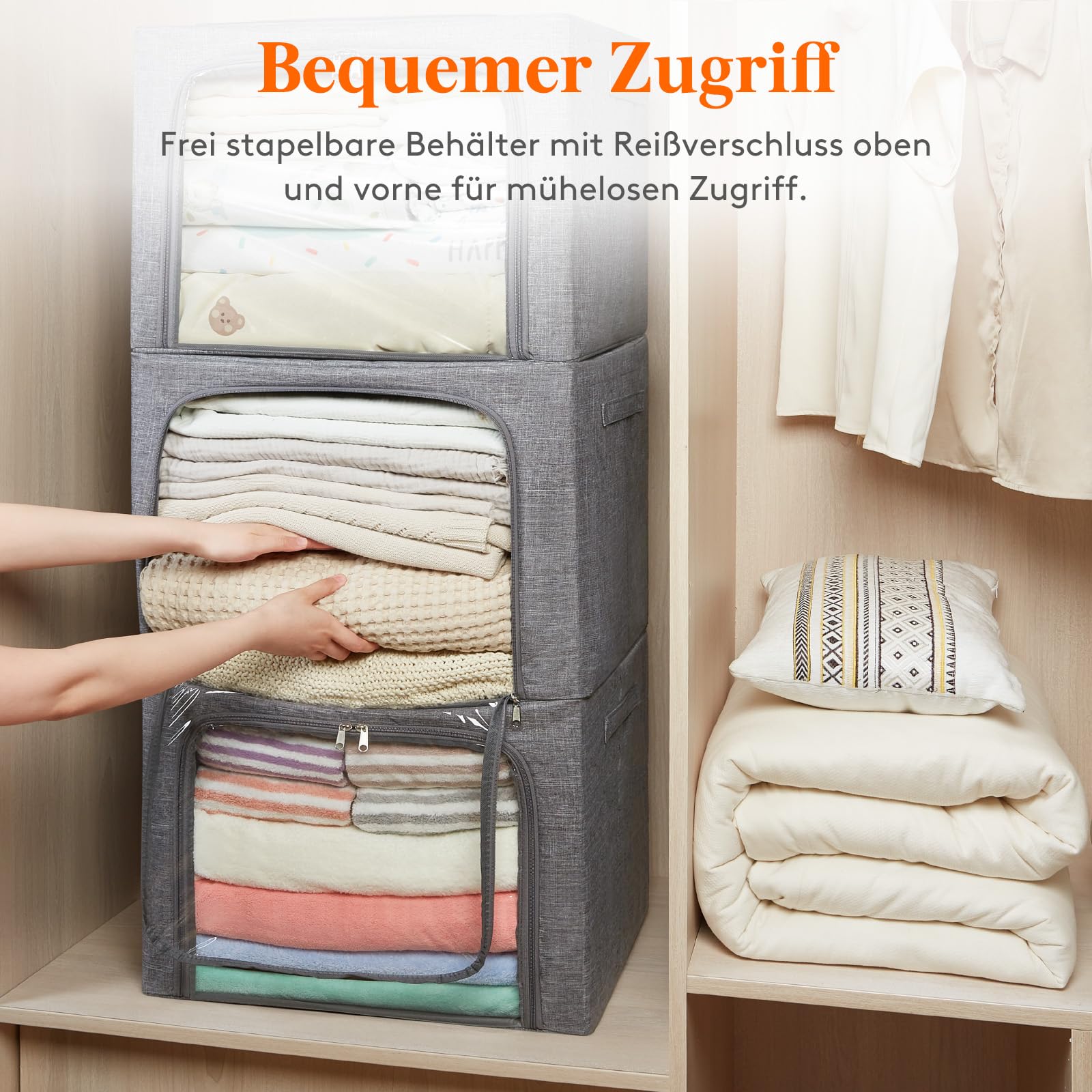 Lifewit Kleiderschrank Aufbewahrungsbehälter mit Metallrahmen, stapelbare faltbare Organisationsboxen mit Deckel, Stoff Kleiderschrank Organiser 100L mit klarem Fenster, Griffe, 3er Set, Hellgrau