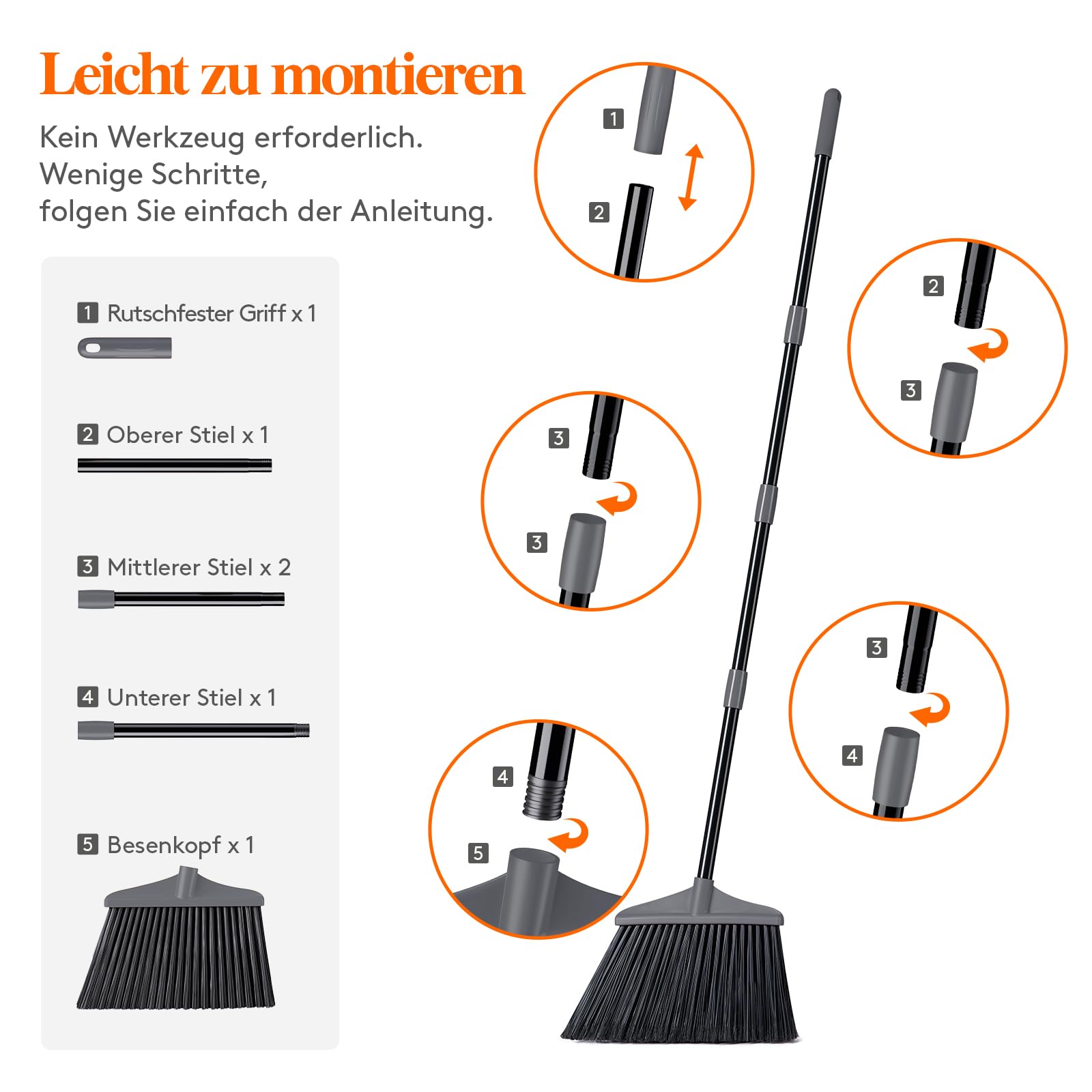 • Einfach montierbar: Dieser Besen ist unglaublich handlich und kann in nur wenigen Minuten zum Einsatz kommen. Um eine reibungslose Montage zu gewährleisten, sollten Sie die Anleitung sorgfältig durchlesen und sicherstellen, dass das Zubehör in der richtigen Reihenfolge zusammengebaut wird. Wenn Sie die beschriebenen Schritte befolgen, ist die Montage spielend leicht erledigt.