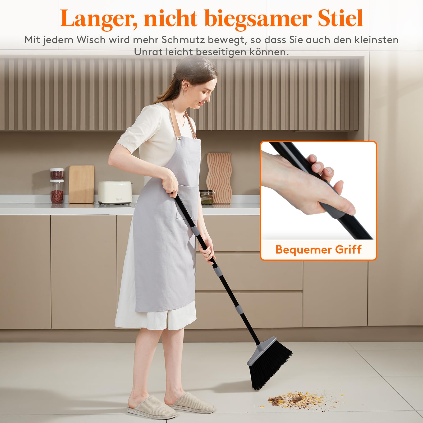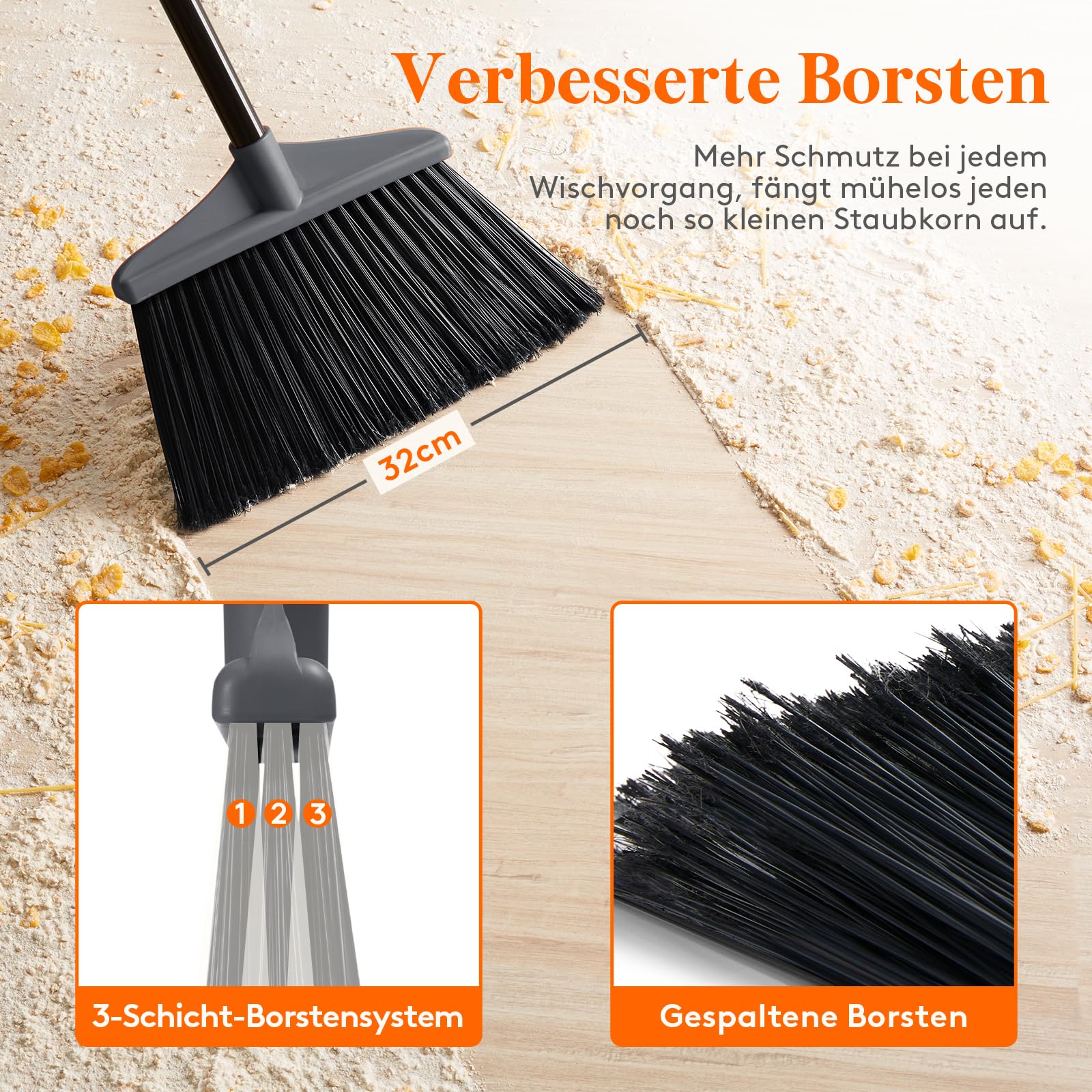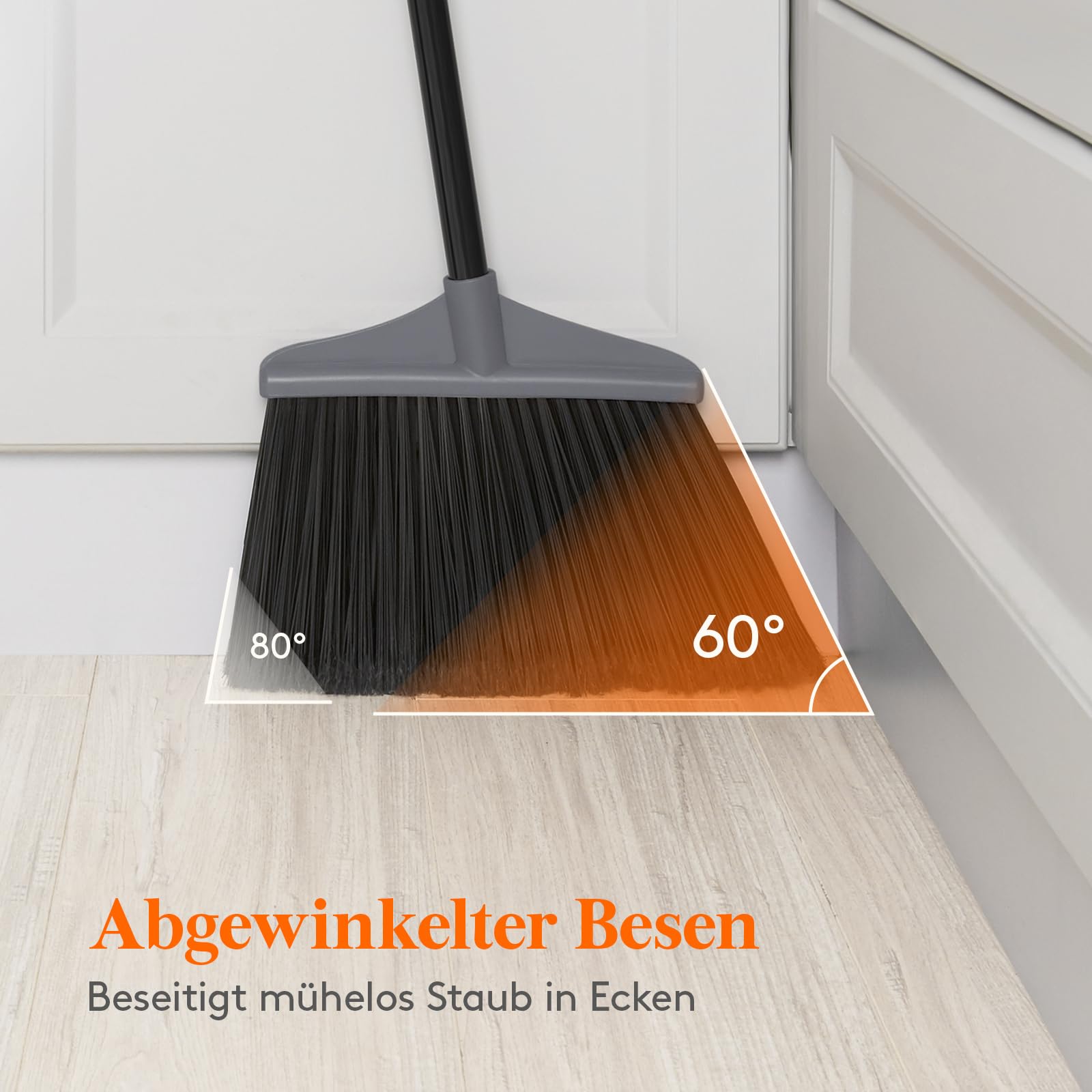 • Ergonomisches Design: Der Winkel des Besenkopfes ist ergonomisch geformt, sodass Sie die Ecken mühelos reinigen können. Die Stange ist 4-teilig und abnehmbar, sodass die Länge verstellbar ist und für Menschen unterschiedlicher Grösse geeignet ist. Sie brauchen sich nicht mehr zu bücken, um den Boden zu kehren. Das macht das Fegen angenehmer und effizienter.
