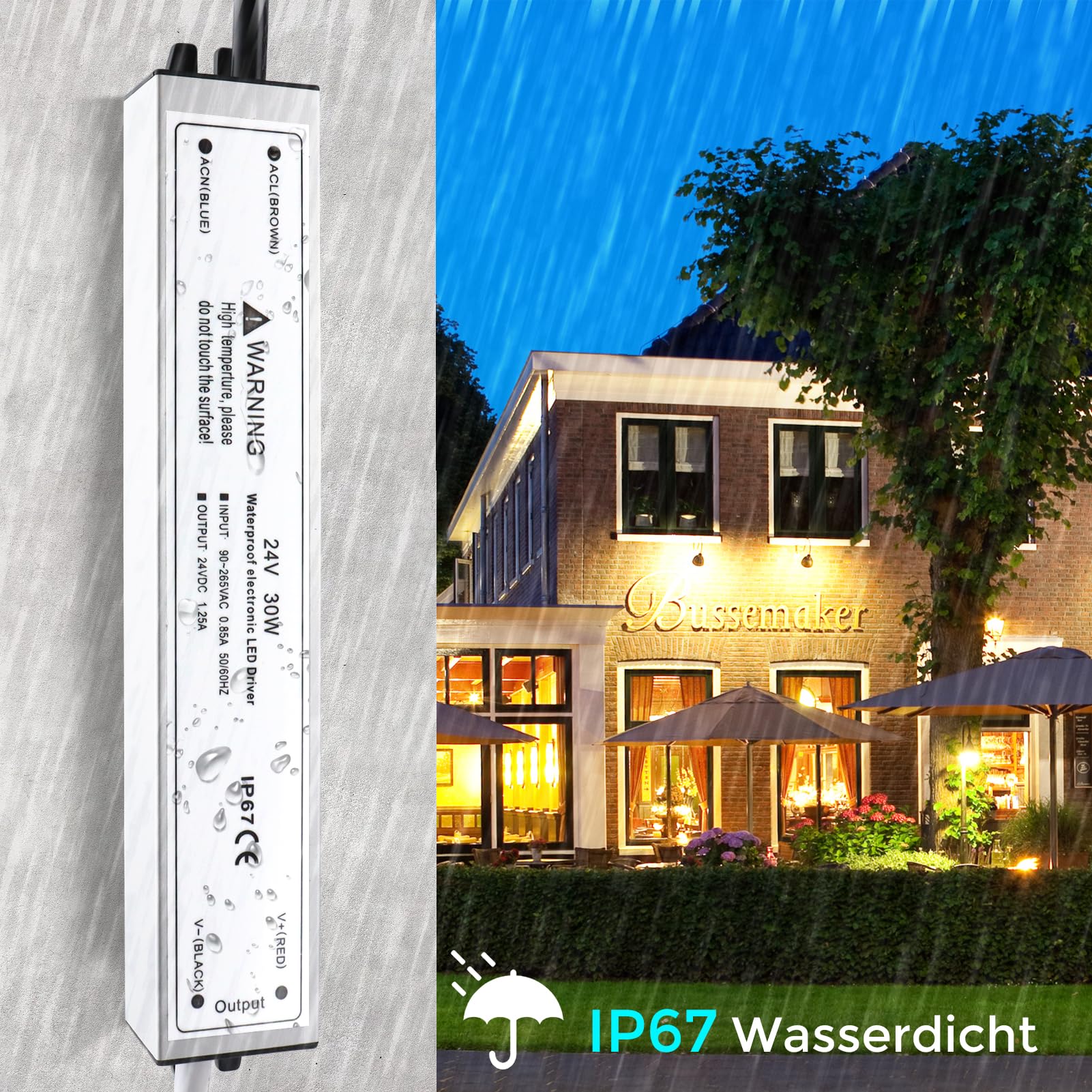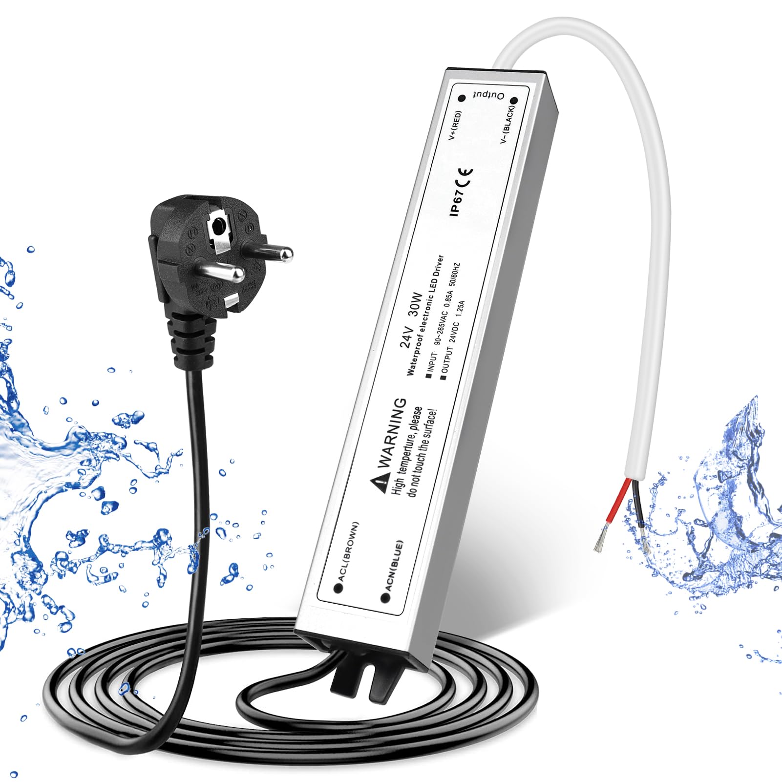 LED Trafo 24V 30W IP67, Outdoor Wasserdicht Transformator mit Stecker, LED Netzteil Treiber 230V auf DC 24 Volt Adapter, Driver Aussen für LED-Streifen Lampen Strahler Lichtbänder