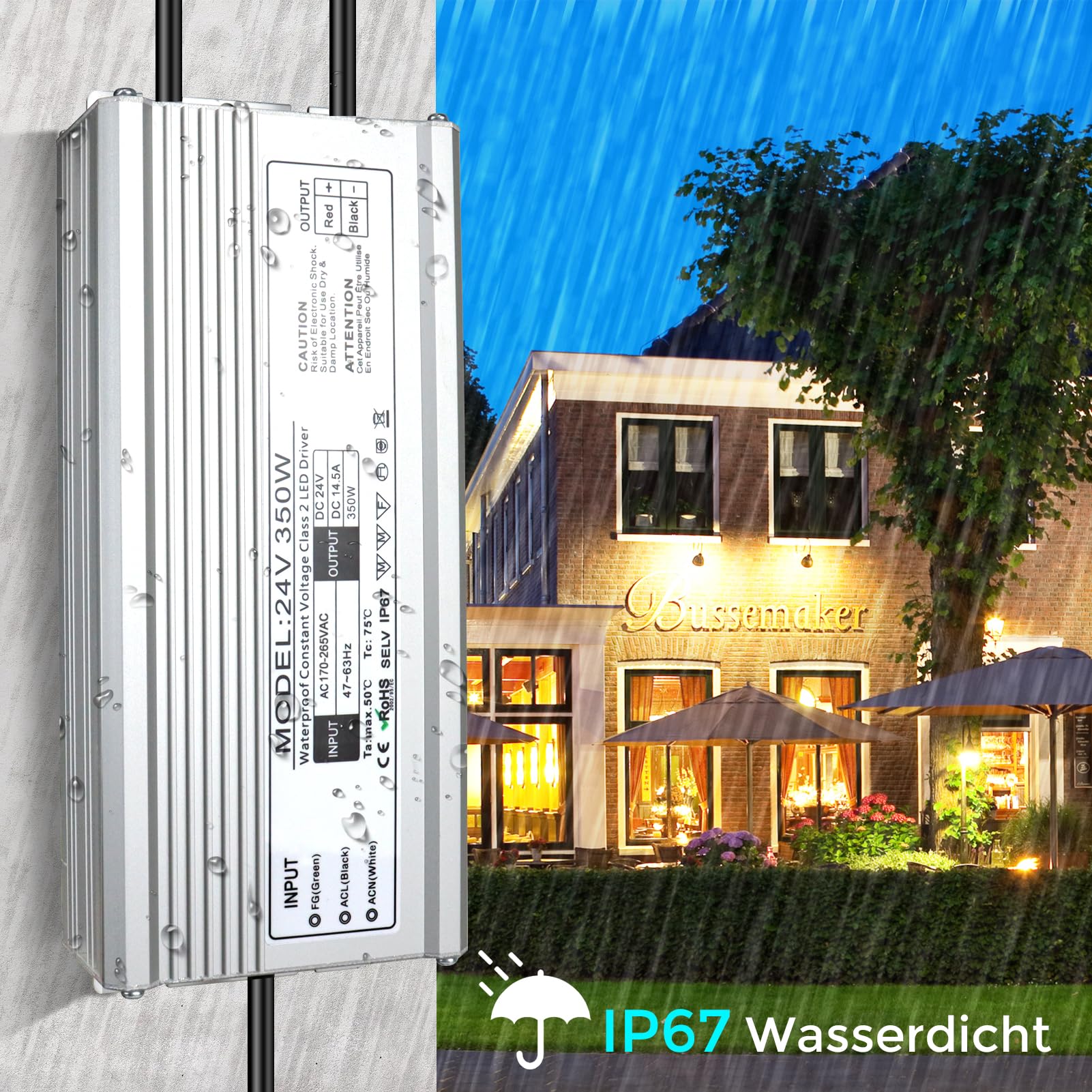 LightingWill LED Trafo 24V 350W IP67, Outdoor Wasserdicht Transformator mit Stecker, LED Netzteil Treiber 230V auf DC 24 Volt Adapter, LED Driver Aussen für LED-Streifen Lampen Strahler Lichtbänder