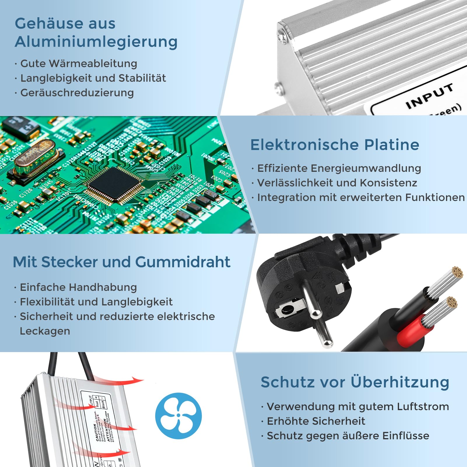 Schutzfunktionen: Kurzschluss, Überlast, Überspannung, Übertemperatur