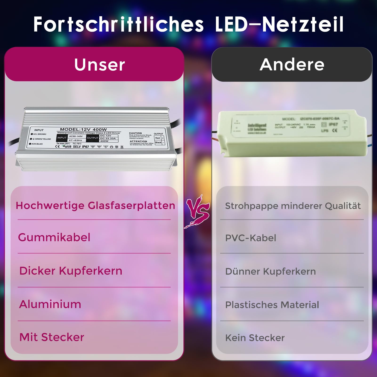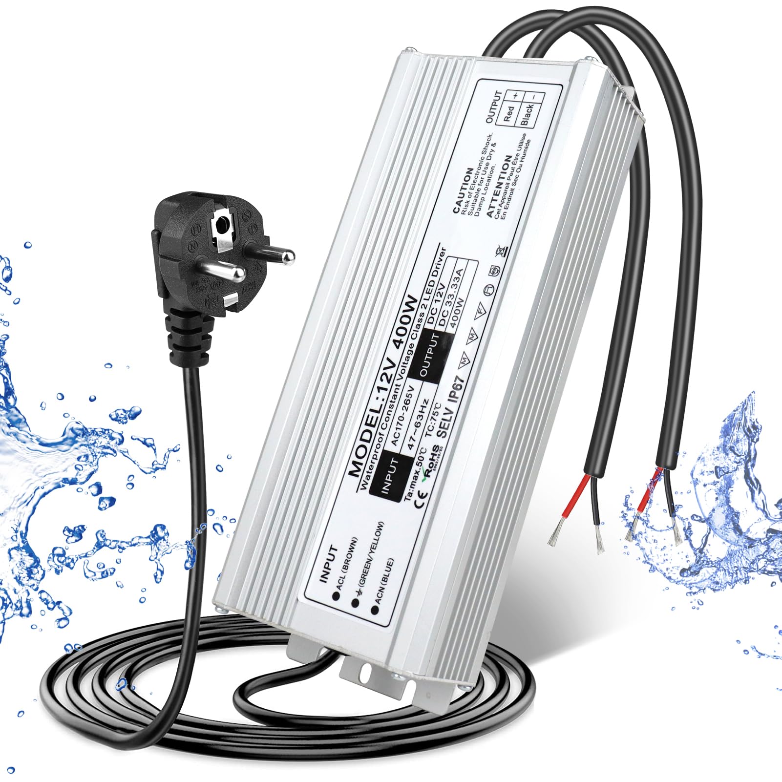 LightingWill Netzteil 12 V 33 A 400 W IP67, Trafo 220 V 12 V, wasserdicht, mit Stecker, Konverter AC 220 V auf DC 12 V, Trafo für Streifen, Lampen und Projektoren