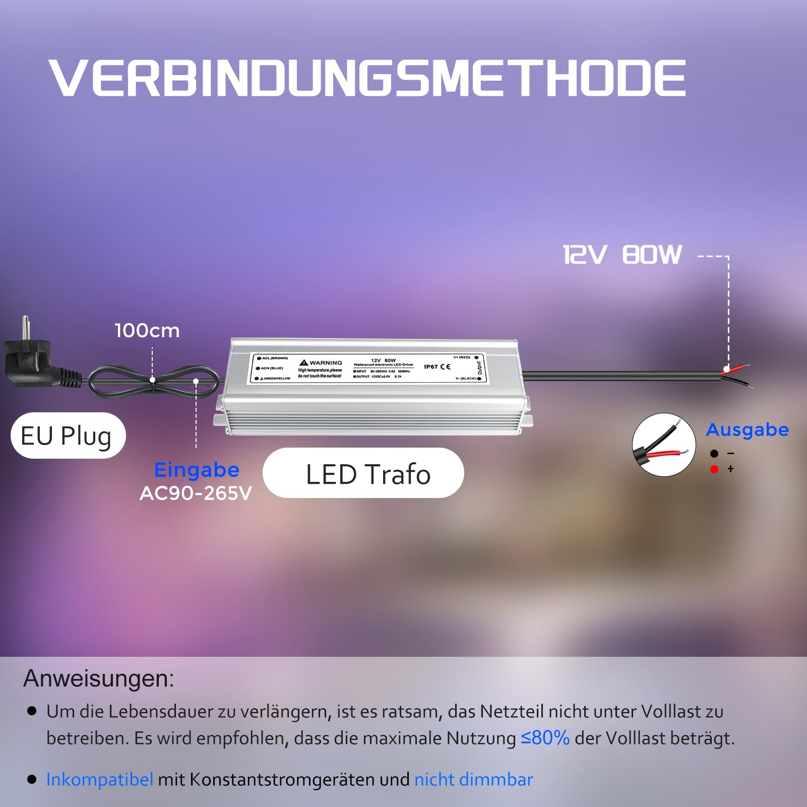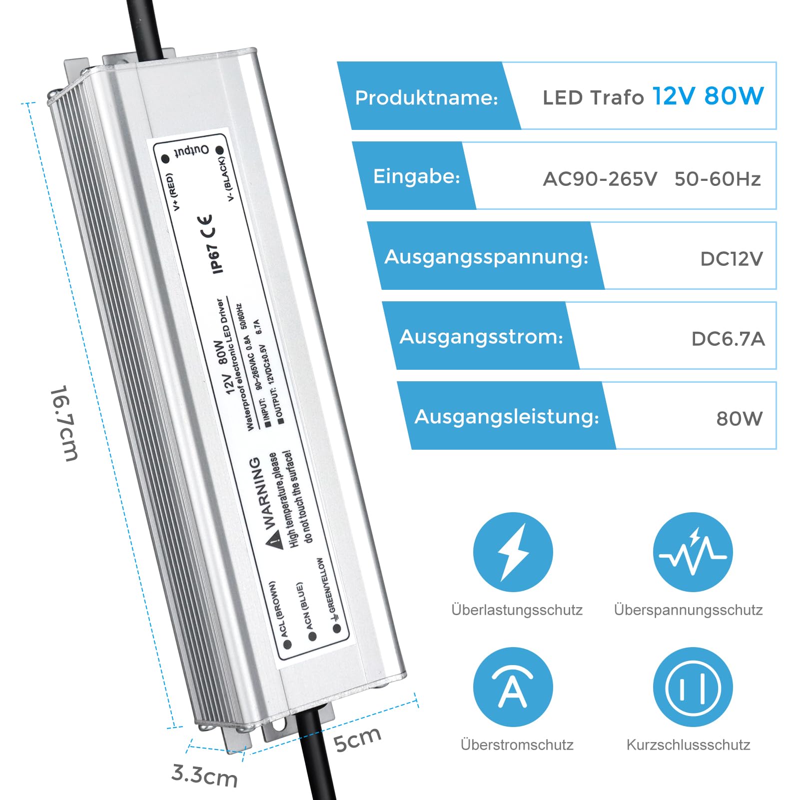 LED Trafo 12V 80W IP67, Outdoor Wasserdicht Transformator mit Stecker, LED Netzteil Treiber 230V auf DC 12 Volt Adapter, Driver Aussen für LED-Streifen Lampen Strahler Lichtbänder