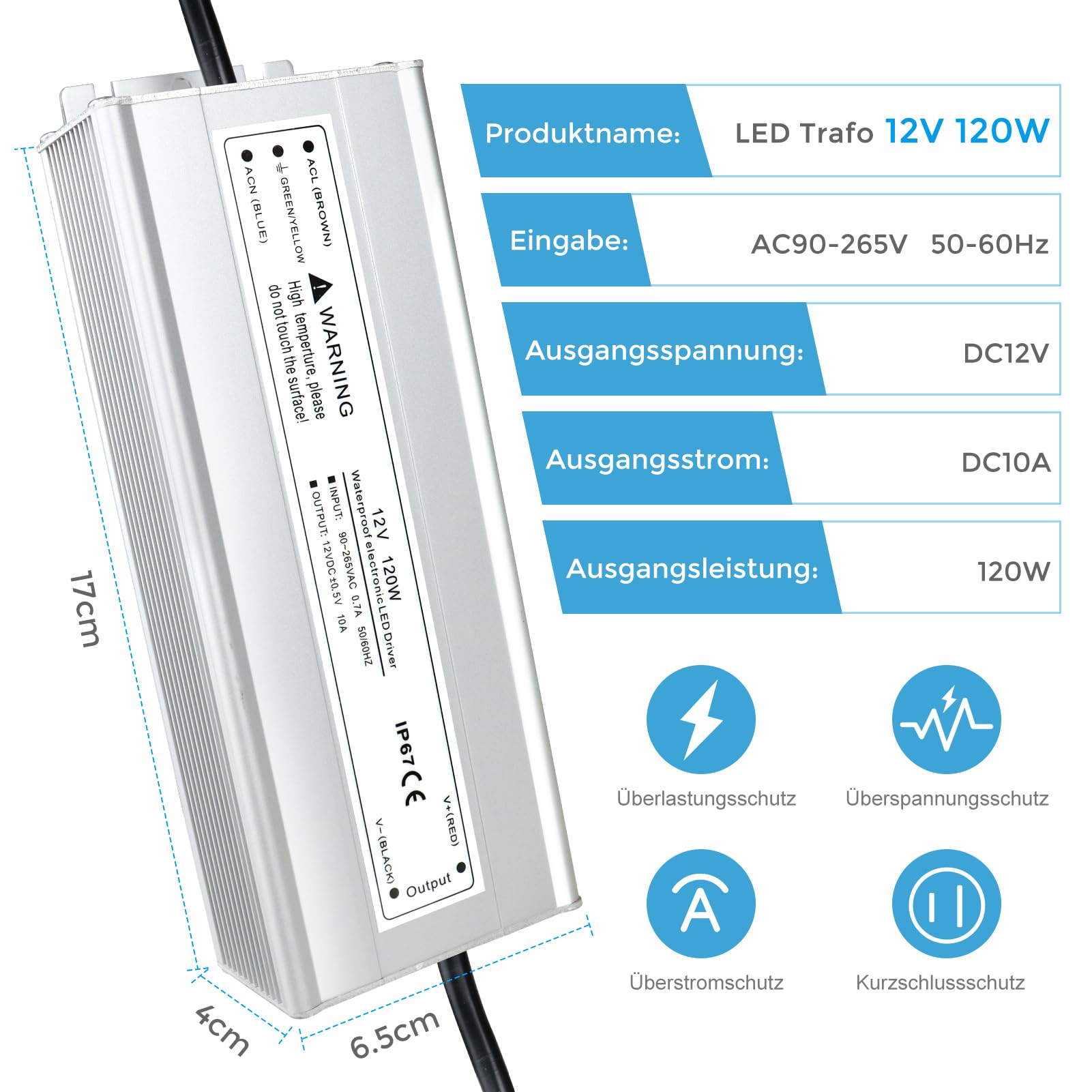 LED Trafo 12V 120W IP67, Outdoor Wasserdicht Transformator mit Stecker, LED Netzteil Treiber 230V auf DC 12 Volt Adapter, Driver Aussen für LED-Streifen Lampen Strahler Lichtbänder