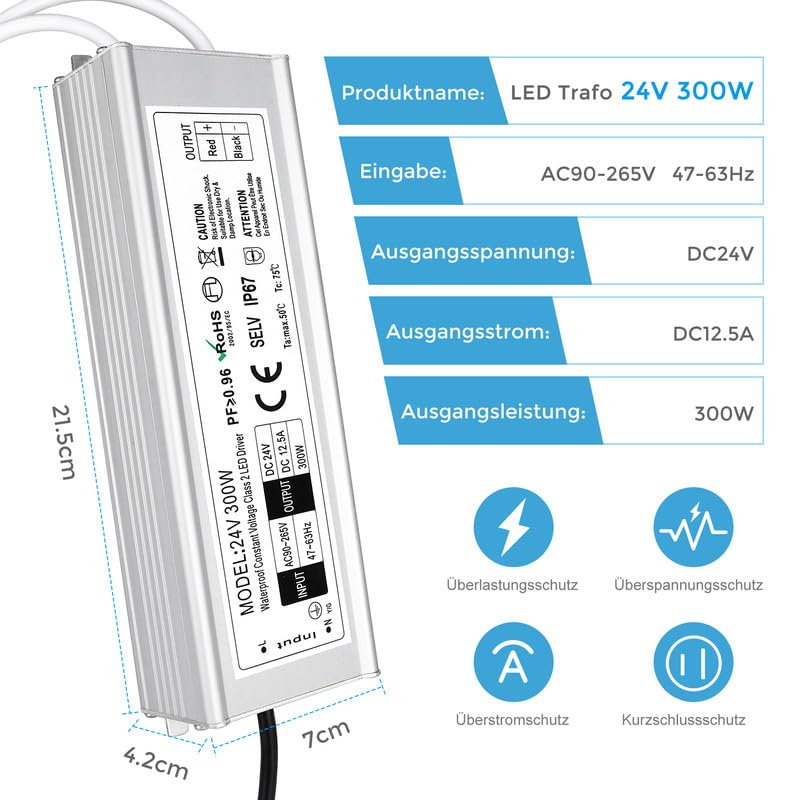 LED Trafo 24V 300W IP67, Outdoor Wasserdicht Transformator mit Stecker, Netzteil Treiber 230V auf DC 24 Volt Adapter, Driver Aussen für LED-Streifen Lampen Strahler Lichtbänder