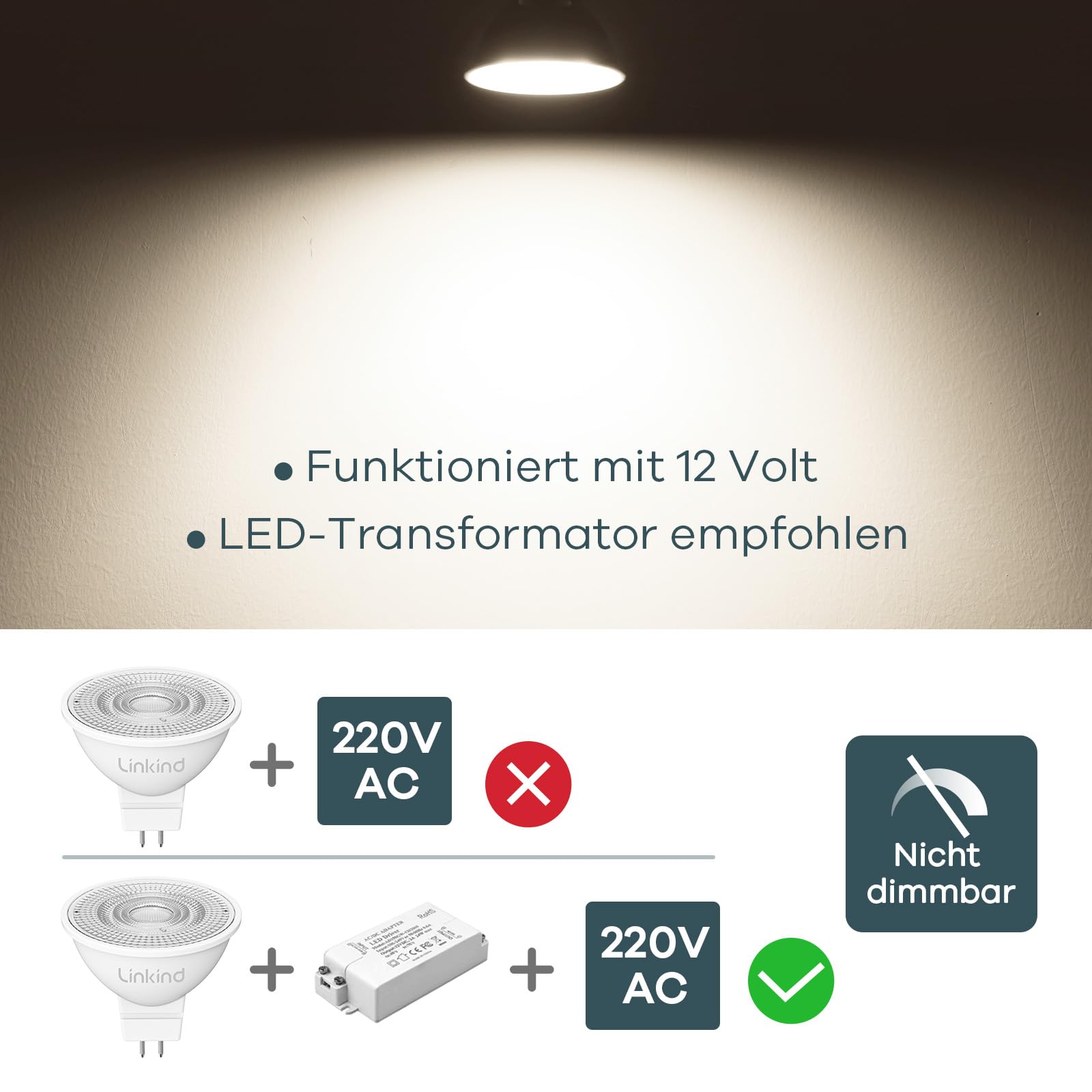 Linkind 12V LED Spot GU5.3 Lampe 3,4W=35W, Neutralweiss 4000K, 360lm Niedervolt 12V MR16 LED Glühbirne mit 36° Abstrahlwinkel, nicht dimmbar, 5 Stück