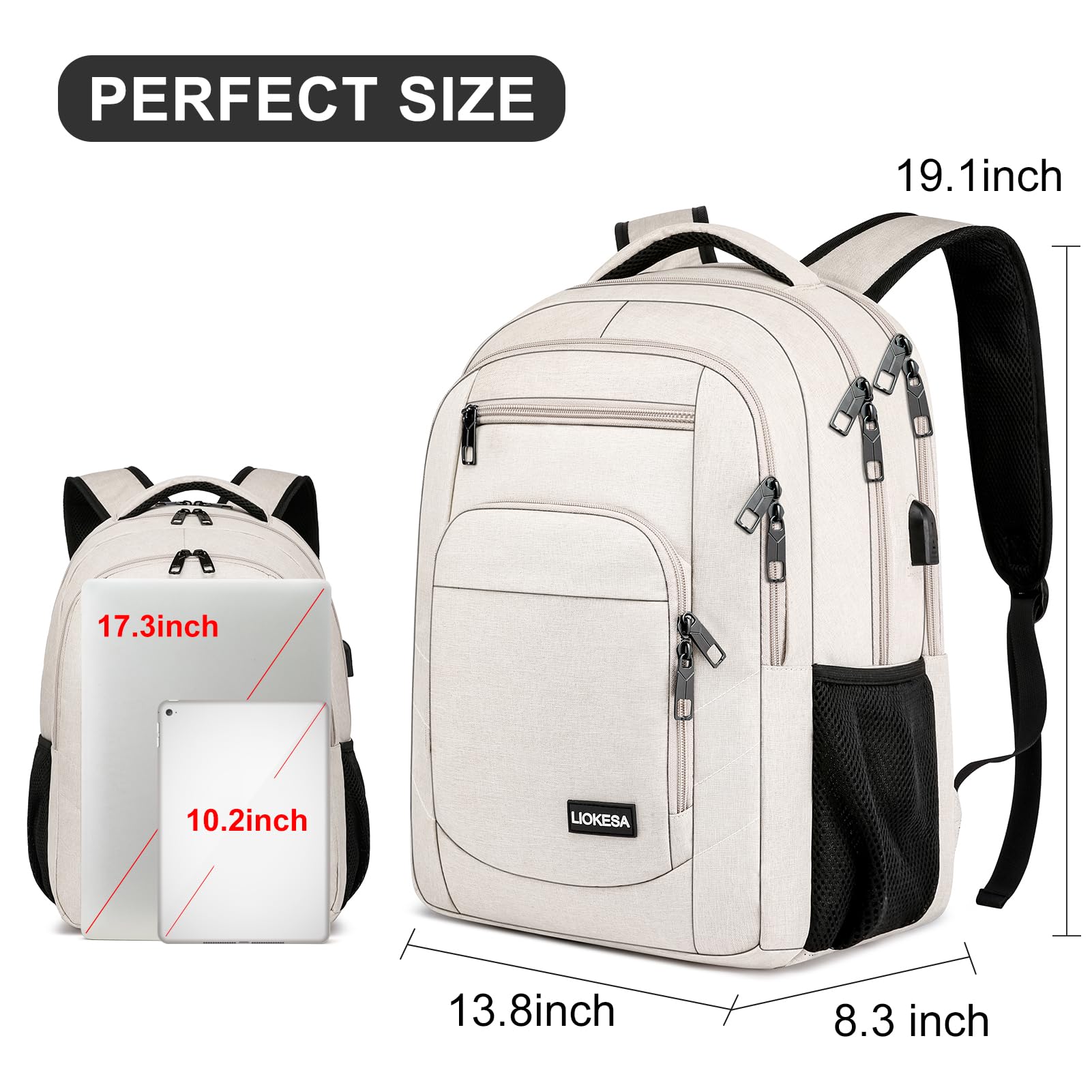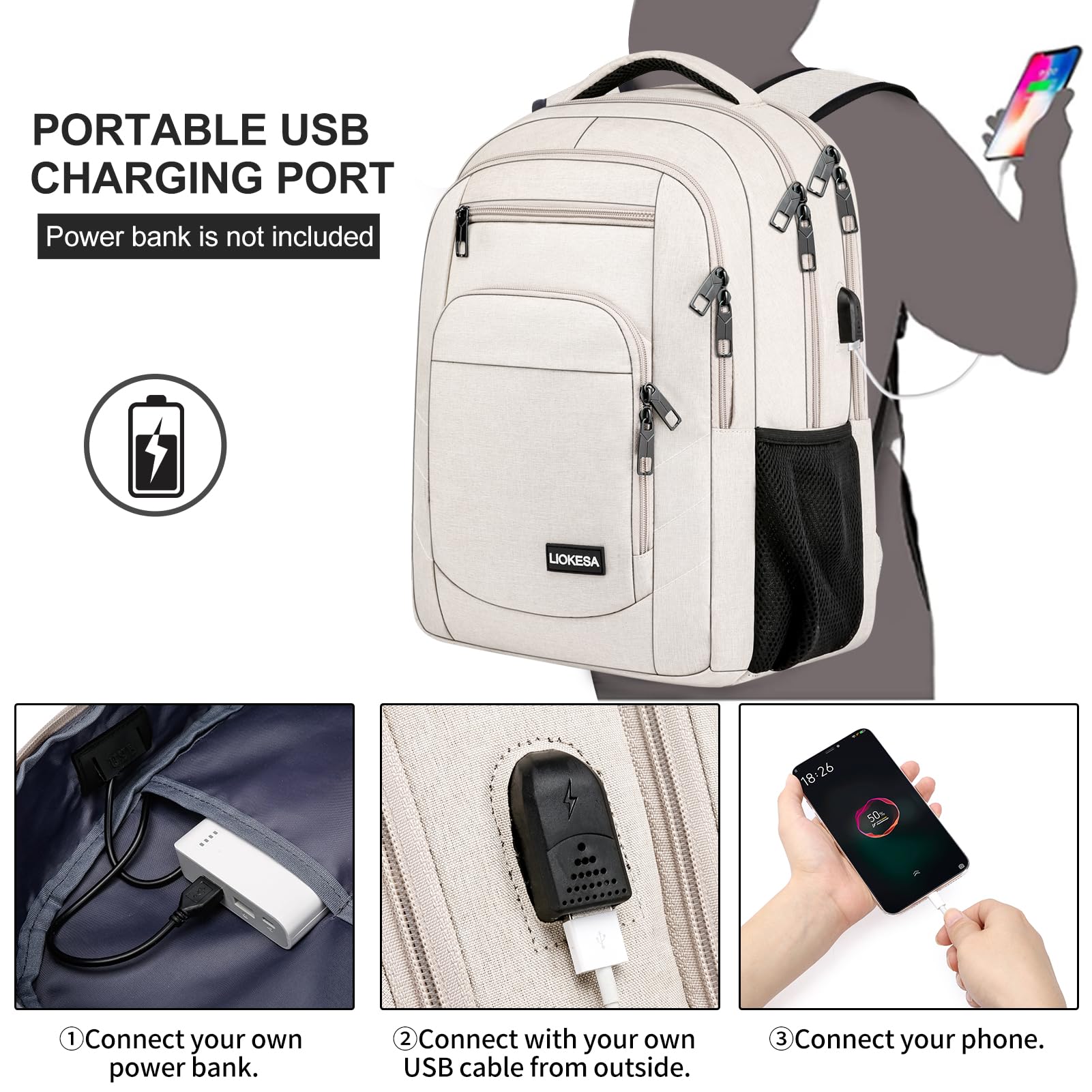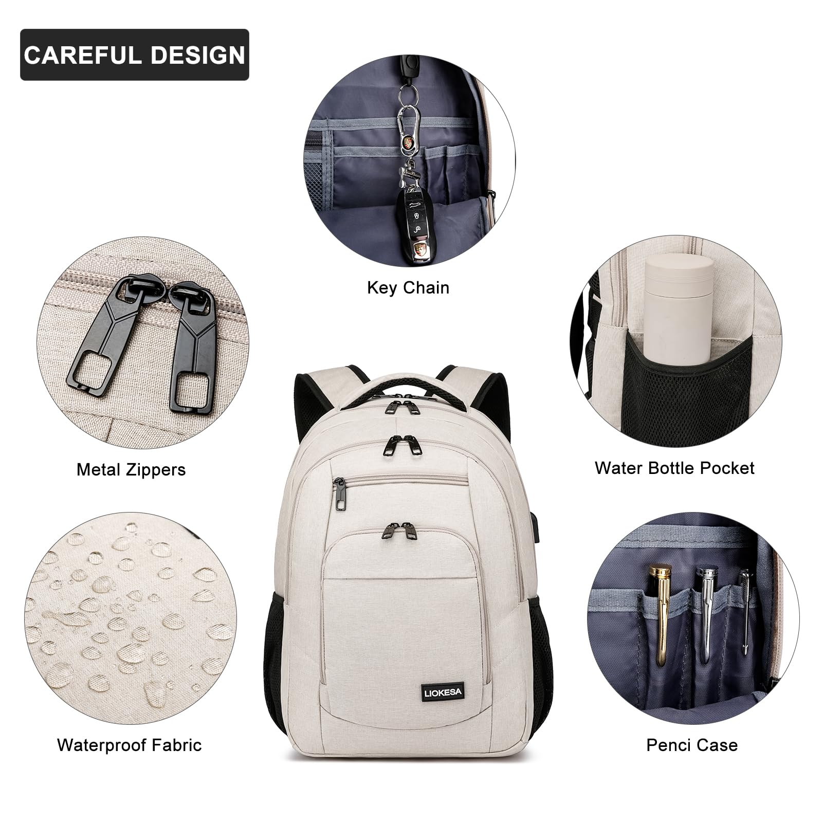 Liokesa Rucksack Herren, 15,6 Zoll Wasserdichte Schulrucksack Jungen Teenager für Schule, Arbeit Rucksack mit USB-Ladeanschluss, für Wandern Reisen, Schule, Business, Oxford, Beige