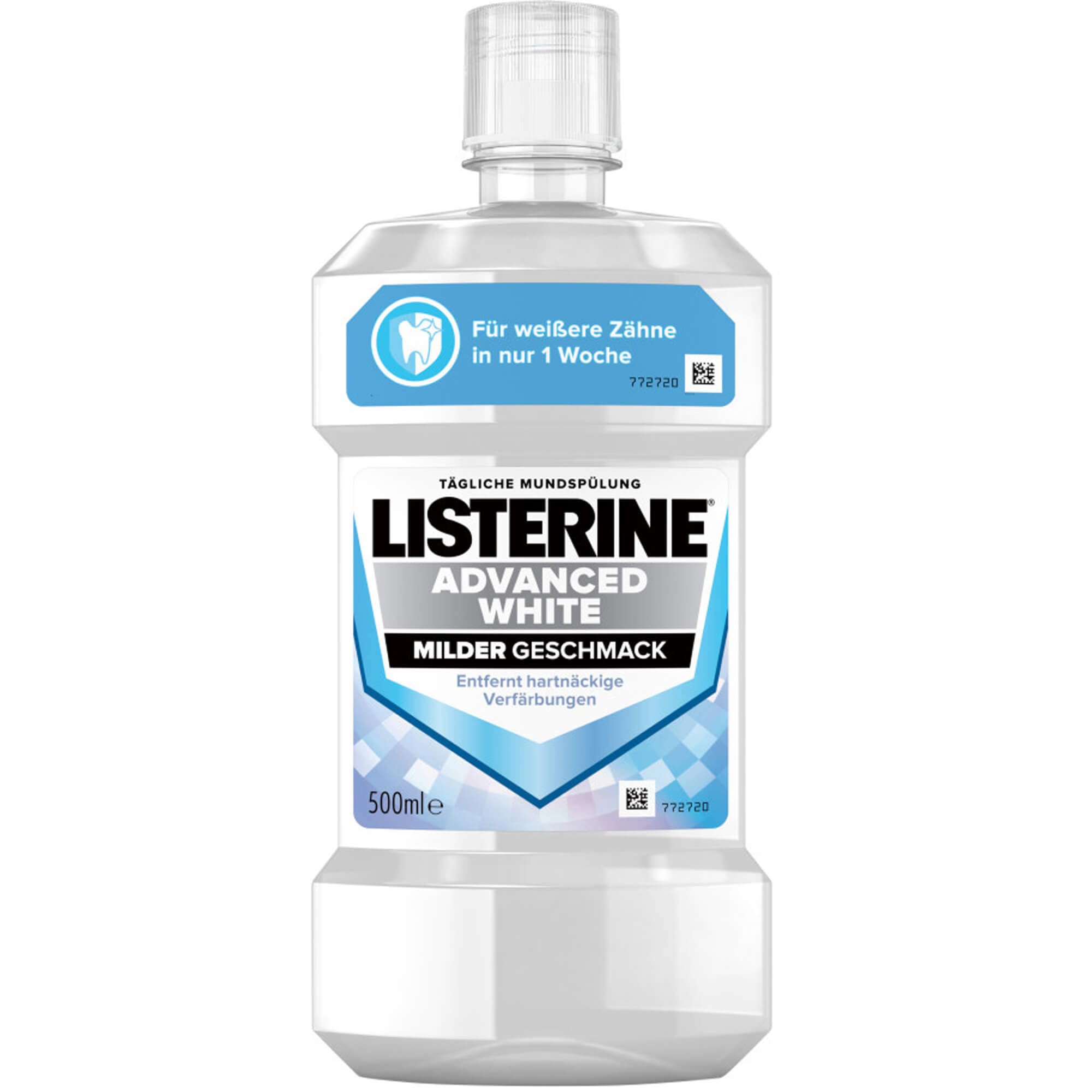 LISTERINE Advanced White Milder Geschmack 500 ml, Mundspülung zur Entfernung hartnäckiger Zahnverfärbungen, für weissere Zähne in nur 1 Woche, Mundwasser bekämpft wirksam Bakterien im Mundraum