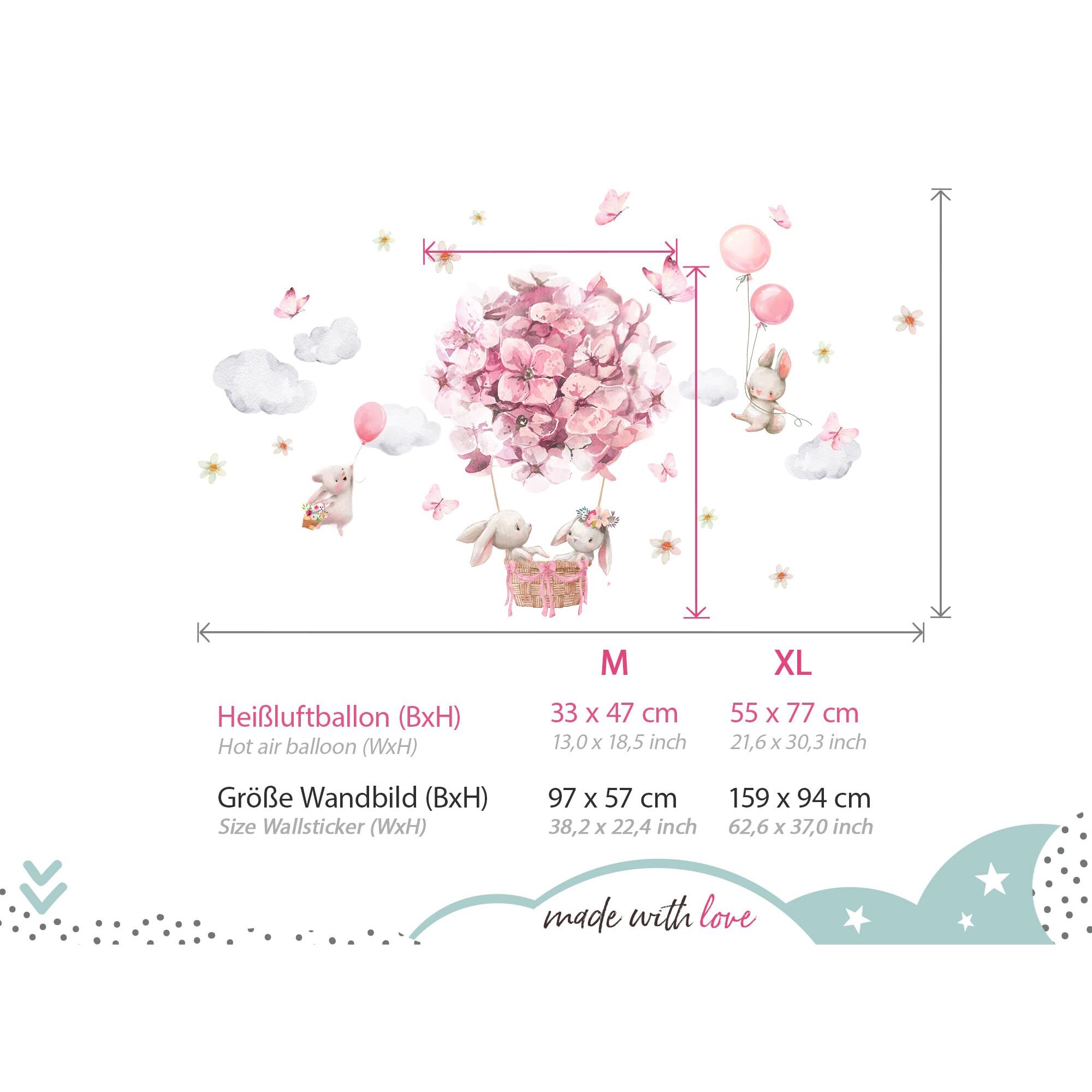 M - 97 x 57 cm und der Heissluftballon hat eine Grösse von 33 x 47 cm